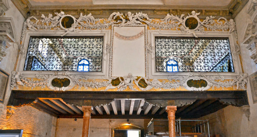 ![]() ![]() History Dedicated to San Simeon Profeta (Saint Simon the Apostle) this church is known as San Simeon Grande to distinguish it from the larger church of San Simeon Piccolo nearby. (Although some say that the grande and piccolo refer to the size of their parishes.) This church was said to have been founded in 967, but the first documented mention is from 1073. It was rebuilt in the 12th-13th centuries and then again in the early 18th century by Dominico Margutti, with interior renovation 1750-1755. This latter work was said to have been ordered by the city's sanitation department who were worried about the plague victims buried under the floor following the 1630 epidemic and so ordered the floor to be relaid. Restoration work in the 19th century revealed that the old floor was still intact under the new. On 18th March 1795 a part of the ceiling fell on, and killed, noblewoman Lucrezia Cappello while she prayed. It is not unusual amongst Venetian churches in having a Greek temple façade, this one dating from 1757 and attributed to Giorgio Massari. It was further renovated in 1861, with work in 2015/6 too. Interior Has pleasingly rough-looking original columns, with Byzantine capitals probably dating from the 13th century, an asymmetric layout - the right-hand aisle is much wider than the left - and round arches. Statues of the Twelve Apostles over the columns in the nave are early 17th century and by Francesco Terilli. The chapel to the right of the chancel has some nice (18th century?) frescoing on the ceiling that's considerably corroded lower down.