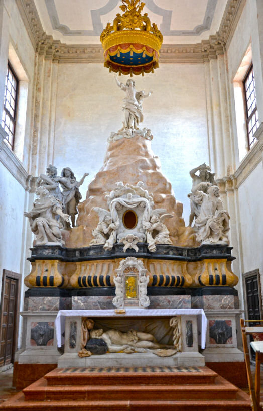 History Called della Zirada from the Venetian word for 'bend', as the church stands at the bend formed by two canals. Another theory has it that it's named for being the turning point for regattas. Traditionally said to have been founded in 1329 as the oratory of a hospice for poor women, founded by four Venetian noblewomen, Elisabetta Soranzo, Marianna Malipiero, Elisabetta Gradenigo and Francesca Cornaro. The convent and church were rebuilt in 1475 and restored in the 17th century, acquiring a lavish Baroque interior with stucco decoration. Suppressed by Napoleon in 1810 with the convent buildings demolished. The church was said to have been worth visiting before the building of the railway bridge for the views across the lagoon to the alps afforded by its then-grass-covered campo. The church later became the studio of the sculptor Gianni Aricò. The church The Venetian Gothic façade is all that survives from the 1475 rebuilding. It has a portal of Istrian stone with two 14th century bas-reliefs (see right): a Dead Christ and The Calling of Peter and Andrew, the latter with details that excite Venetian boat buffs. Interior There's a barco (nun's gallery) over the door from the 15th century, supported by columns left over from the 14th century church. The rich decoration on the barco was added in the 17th century. The baroque altar of 1679 is by Juste Le Court. Four side altars with 18th century marble statues. Jan Morris says that there is a plaque in honour of the Guild of Refuse Collectors which was mounted above the church door here (presumably inside) during the days of the republic.