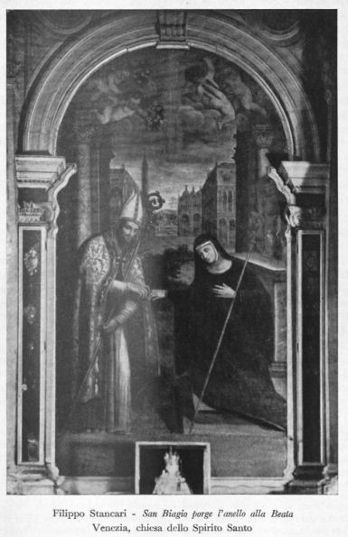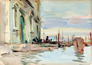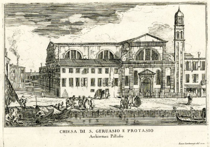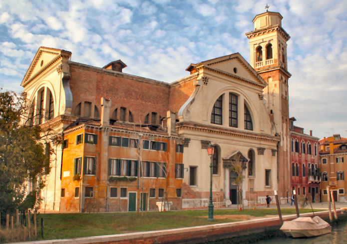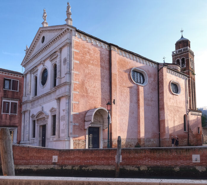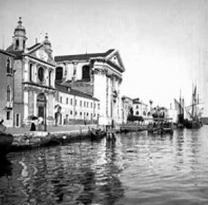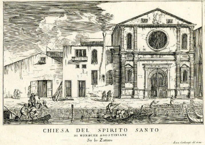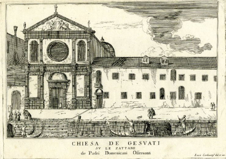 History The church and its Augustinian convent were founded in 1483 by Maria Caroldo, who became it's first abbess, with the help of her brother Jerome and a priest called Giacomo Zamboni. The church was rebuilt in 1506 to a design by Antonio Abbondi (known as Lo Scarpagnino). The Scuola to the right of the church (with a façade looking very similar but less squashed) was also added in 1506. In 1520 the Zattere fondamenta was built and the old church's apse was demolished. As a result the orientation was reversed and the present Lombardesque façade built. It was finished in 1524 by Giacomo de Bernardis, under Scarpagnino's supervision. It was here that the murderers of Lorenzino de'Medici took refuge after attacking him outside the church of San Polo in 1548. Suppressed in 1806, but reopened a few years later. The convent became a school, the Scuola became a tobacco warehouse and then a private residence. It has been closed since 2005, with the church presumably stripped of all art and fittings. Or so I had no reason to doubt, until I was sent some hastily-taken interior photos in March 2020 (see right) by Caroline, the wife of the author of my quote in The church in fiction below, who even got shouted at for her trouble. They show the church used as storage, probably by the local art school, but not at all stripped and bare. The interior The interior is reported to be very redolent of 200 years of restoration, with an aisle-less nave, 18th-century side altars, and a baroque high altar with Solomonic columns. The inner façade is taken up with a funerary monument to Paolo Paruta, an historian of the Venetian Republic who died in 1598, said to be by Longhena and built around 1651. His son Marco, who died in 1629, and brother Andrea, who died in 1622, are buried here too. All of which is born out by the 2020 photographs where the three busts on the monument are visible. Art highlights ![]() The church was said to contain altarpieces by Buonconsiglio (Jesus Between Saints Jerome and George (see Lost art below) and Saint Gregory Enthroned with Angels), Jacopo Guarana (Saint Matthew), Francesco Migliorini (The Resurrection and The Ascension), Filippo Stancari (The Marriage of the Virgin and The Blessed Giuliana di Collalto Receives the Abbey Ring from San Biagio) (see postcard right) and Jacopo Bassano, mostly from other closed churches. But given that the much more obscure painting mentioned first below is now in the Accademia, I always doubted that any of these works were still to be found here. But the 2020 photos show altars and altarpieces still in situ. Of the two side altars on the left in the photo (below right) the left-hand one looks like Filippo Stancari's Blessed Giuliana di Collalto which, given she founded the place, must surely have come from Santi Biagio e Cataldo on Giudecca. The second altar looks like a Virgin and Child in Glory, with a couple of saints maybe, and a putto. Lost art The Pentecost by Polidoro da Lanciano, an assistant to Titian, is now in the Accademia. As is the work by Giovanni Buonconsiglio, a sacra conversazione showing Christ the Redeemer with Saints Jerome and Liberalis of Treviso (San Liberale in Italian), but it's reportedly in a poor state. The nearby Anglican church of Saint George has a 19th century copy with Saint Liberalis transformed into Saint George, with Liberalis's usual flag of a white cross on a red background changed to the red-on-white of Saint George. To further muddy the waters a Buonconsiglio high altarpiece is said to have come here in 1523 when the church and convent of San Secondo closed and the nuns moved to Giudecca. This work, dated to about 1505, showed Saints Erasmus and Secundus flanking Christ. These two works may well be one and the same. The church in art ![]() Venice from the Giudecca, San Giorgio Maggiore to the Right by (the circle of) Johan Anton Richter shows Spirito Santo and it's scuola to the left. Five watercolours by John Singer Sargent 1902-4 and one by his sister. This watercolour (see right) was once owned by William James, the son of William Sr and nephew of Henry, it having been given to him by Sargent's sister.