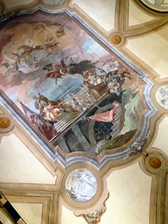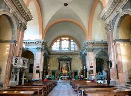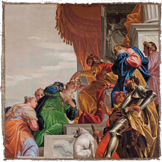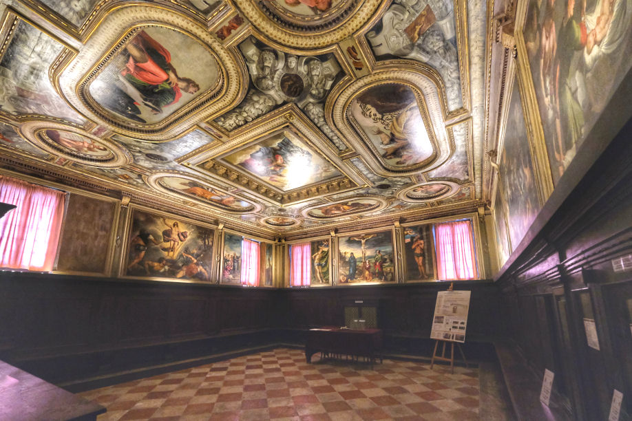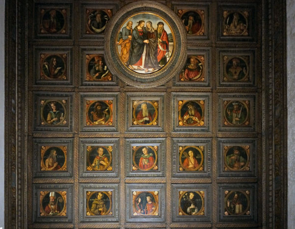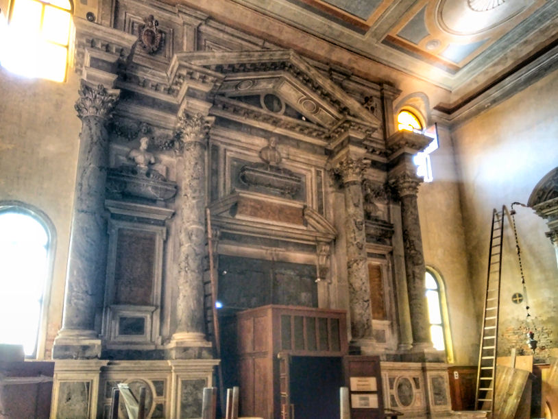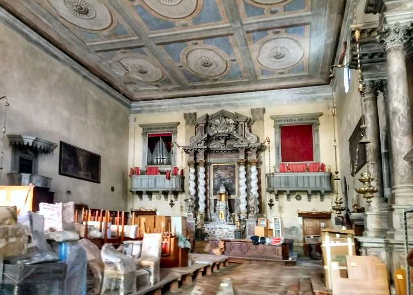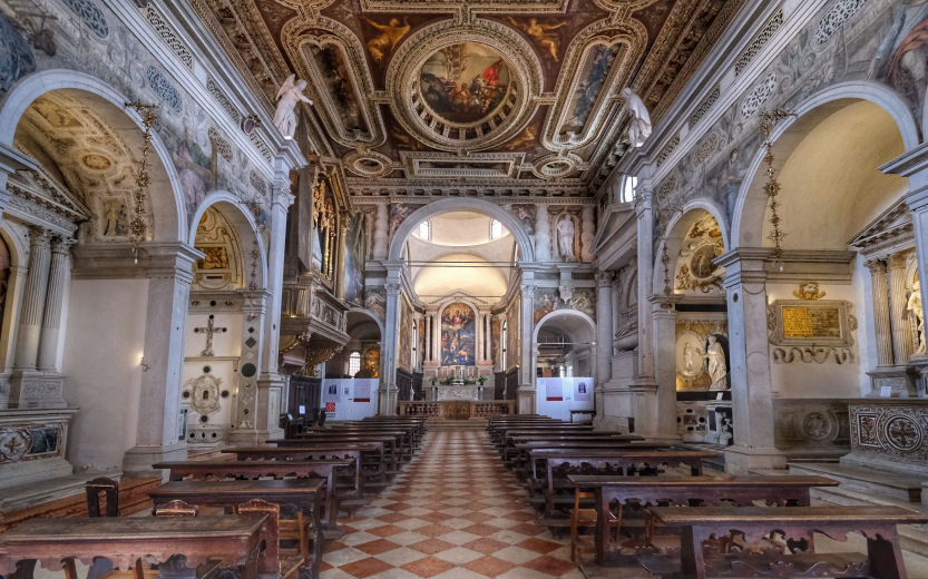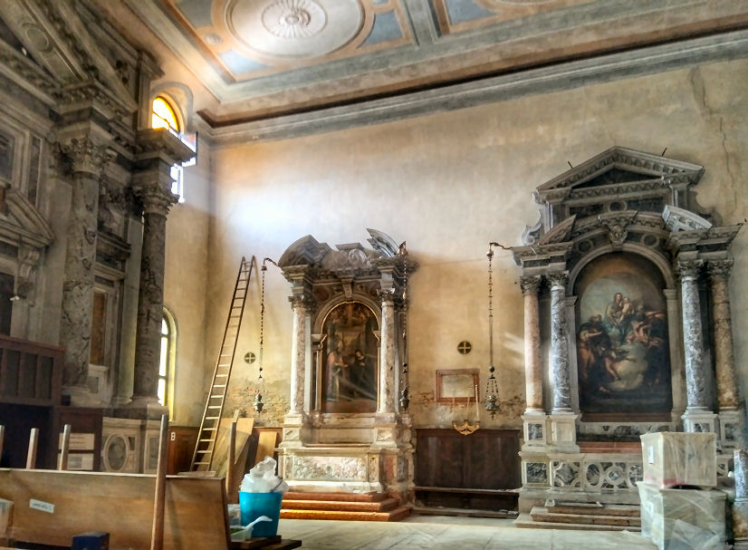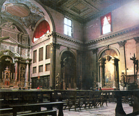 and it was his last built church. The church and the convent next door were suppressed in 1810 by Napoleon and the convent was partially demolished before being rebuilt in 1856. It now houses the University of Venice's department of literature and philosophy. Extensive restoration work on Veronese's ceiling paintings and framework in 1832-33 and cleaning in 1962. In more recent years more extensive restoration work has seen the church a place of scaffolding and noise for most of the noughties. The church The façade, the final part to be completed, is dominated by the two pairs of Corinthian columns at the ends on each level, which support a large tympanum with statues of Saint Jerome, Saint Catherine of Alexandria and, in the middle, Saint Sebastian. The interior and art No aisles but three good-size altar niches either side, under a nun's gallery which wraps around the nave, also forming a narthex at the back. None of the nave chapels have first-rate altarpieces, and only one is by Veronese. What they do have is cards telling who the rich American was who stumped up the cash. The ceasing of the protrusion of this block of altar niches at the back forms a transept of sorts, with the organ and entrance on the left and the monumental tomb of on the right. A deep domed presbytery is flanked by two deep side chapels As you go to the Madonna dell’Orto or the Scuola di San Rocco for Tintoretto and to San Giorgio degli Schiavoni for Carpaccio, this is where you come for Paolo Veronese. It was his parish church, and doubtful tradition has it that he found refuge in the monastery after killing a love rival. He began decorating it at the age of 30, working here from 1555 to 1581. His commission came from the then prior here, Bernardo Torlioni, who was also originally from Verona. Veronese died in 1588 and was buried here - his tombstone is in the floor in front of the Lando Chapel, in the left transept, with a bust on the wall above. He is buried next to his brother Benedetto Caliari, also a painter, who helped out, completing the work in the nave in less than a year after Paolo's death. Almost all of the decoration of the interior is the work of Veronese and his studio - the paintings around the choir and on the ceiling and the organ doors, the frescoed walls, featuring figures and architecture, and the sacristy, which is earlier work. The nave ceiling, begun by Veronese in 1556, just four weeks after he finished in the sacristy, shows scenes from the Life of Esther, and on the gallery walls the Trial and Martyrdom of Saint Sebastian. The central panel of The Coronation of Esther (see right) echoes the Coronation of the Virgin panel that Veronese had painted for the sacristy the year before, Esther being seen as the Old Testament prototype of Mary. Restoration of these panels took place in the Abbazia della Misericordia, next to Santa Maria Valverde from 2008. The trompe l'oeil painting here blends unnervingly smoothly with the actual architecture, which had been finished only a few years before. You get the impression that the church was built specifically to house the trompe l'oeil vistas and the combination of art, sculpture and architecture is all-over seamless. Veronese had trained as a stonecutter too, that being his father's profession, and designed the altar, along with the organ and the choir stalls. The high altarpiece was commissioned from Veronese by the Cornaro family, including Caterina. It depicts Saints Sebastian with Saints John the Baptist, Francis, Peter, Elizabeth, Catherine and the Virgin in Glory with Musician Angels. Ridolfi says that Saint Francis is a portrait of Veronese's patron here, Bernardo Torlioni. On the side walls of the sanctuary are panels of Saints Mark and Marcellian Led to Martyrdom and The Martyrdom of of Saint Sebastian, said to have been painted by Veronese to replace damaged frescoes of the same subjects. There's a smoky late Saint Nicholas of Bari by Titian, painted when he was 86, on the right as you enter. Also works by Palma Giovane and an 18th-century painter called Federico Bencovich. The sacristy Through a door on the left under the organ, contains Veronese's first work here from 1555 (see photo right). His canvas ceiling panels depict the Coronation of the Virgin in the centre, with four ovals depicting the Four Evangelists surrounding it. There are putti in the four tondi at the corners (said by Ridolfi to be the work of pupils), and painting onto the woodwork of the ceiling, depicting Old Testament scenes, that have lasted less well than the canvas panels. Before he began there were already works here by artists from Verona of an earlier generation, including a Crucifixion by Domenico Brusasorci and works by Bonifacio de' Pitati.