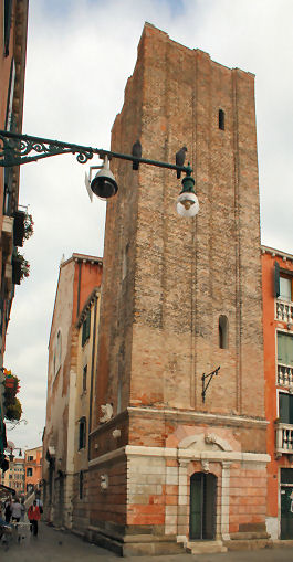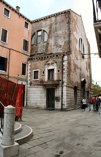 History One of the oldest churches in Venice, originally built by a merchant called Geniano Busignaco in 836 and consecrated in 853, during the reign of doge Pietro Tradonico. The first certain documentation for this first church however is 1108. It was said to have been a three-aisled basilica with a gold-covered apse of mosaics and to have had a dome supported by four marble columns. By the time of De Barbari's map there is no dome. The current church dates from the 1687 rebuilding by Giovanni Battista Lambranzi, the parish priest, also responsible for the nearby, and similarly plain-fronted, church of Le Eremite. Saint Margaret of Antioch was a saint very popular in the East, as was Saint Pantaleon who has a church very nearby. The church was suppressed in 1808, becoming a tobacco factory and then a storehouse for marble from the other suppressed churches. From 1882 the building was used as a Protestant church, then the studio of sculptor Luigi Borro, and then a cinema. In the early 1990s it was converted by architect Luciano Gemin into a lecture hall for Venice University's architecture faculty. Peering through the door you'll see a plain space with the look of a conference centre, the pews having been replaced by rows of stacking chairs. But interior photos show considerable conversion to a theatre (see right), and that the ceiling painting The Martyrdom of Saint Margaret, attributed to Antonio Zanchi, is still in place. Various carvings from the church have been set into the campanile stump and the walls of the adjacent house. ![]() Campanile In 1808 the upper part of the campanile was demolished as it was unsafe, leaving a 46ft stump for use as accomodation. The painting below, by Gabriel Bella, shows the campanile intact in the late-18th century, but looking a bit wonky.