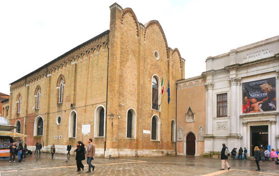 History The first documented church and convent on this site were founded in 1134 by an Augustinian order of friars from Ravenna, although it is said there was a wooden church on the site before this, erected to house a miracle-working Virgin. The 12th-century church was consecrated by Pope Alexander II on April 5th 1177, following the six months he spent as a monk in the convent hiding from Frederick Barbarossa. (This episode is celebrated in the 1584 Doge Sebastiano Ziani's Recognition of Pope Alexander III at the Monastery of the Carità by Carlo and Gabriele Caliari in the Doge's Palace (see far below right). In 1260 the buildings passed to the Scuola Grande di Santa Maria della Carità, which was originally a flagellant confraternity, like all six of the original Scuole Grande, and had been established in 1260 in the church of San Leonardo in Cannaregio. The church at this time had an external portico, once a common feature in Venice but the only two remaining are at San Nicolò dei Mendicoli and San Giacomo di Rialto. A guildhall was built beside the convent in 1344, followed in 1441-47 by a larger Gothic church overseen, and with stonework, by Bartolomeo Bon. The 12th-century convent was expanded from 1561 to designs (or arguably just suggestions) by Palladio, but most of this work was destroyed in a fire of 1630. Palladio spent a year supervising, the work having actually been carried out by Antonio Palieri da Marcò. A wing of the brick and stone cloister, the elegant sacristy, and (maybe) a snail-shaped (chiocciola) staircase are all that remain as evidence of Palladio's involvement. The order was suppressed in 1768 and following the church's suppression, and partial demolition, in 1807 it was decided that the whole complex was to be converted into a home for the Venetian Academy. Work began in 1811, headed by Giannantonio Selva, and the gallery opened in 1817. The Gothic church was treated much worse than the then more fashionable Palladian monastery elements - it was stripped of all decoration during this work, the barco and chapels were destroyed, the windows walled over, and the space divided in two horizontally. Skylights were also installed, as you can see in the old postcard (see right). Some of this work was reversed in the mid/late -20th century. Campanile Visible in both of the Canaletto paintings mentioned below. It dated to the building of the original church, but suddenly collapsed on March 17th 1741. It fell towards the Grand Canal so it didn't damage the church, but it did demolish two houses and the splash washed two traghetti into Campo San Vidal opposite. Lost art An altarpiece painted around 1468 by Giovanni Bellini, and four triptychs of 1462/4, each missing its frames and with lunettes. Following the Napoleonic suppression the frames were lost and the panels divided between the Brera, the Correr Museum, Vienna, and the Accademia. The process of getting them back together began in the late 19th century and was only completed in the mid-1950s. Which panel goes with which is still debated. Until recently they were said to be by Giovanni, but it's recently been argued that they're by Jacopo Bellini with help from both of his sons, but the degree of Giovanni's involvement is still argued. All four were originally in family chapels built 1460-64 along the wall under the barco in the church but are now in the Accademia. Currently in the new 15th century rooms are the Triptych of Saint Sebastian, with Saints John the Baptist and Anthony Abbot, with a lunette of God the Father and the Annunciation. Next to it is the Triptych of the Virgin and Child with Saint Jerome and a Bishop Saint, with a lunette of The Man of Sorrows with Two Angels. The Nativity triptych is undergoing conservation at the moment (late 2020) Gold-ground panels with Saint Francis and Saint Victor flank the Nativity, which has a landscape background. The fourth centres on Saint Lawrence. A Crucifixion with the Virgin and Saint John the Evangelist, a very early and Mantagna-looking panel by Giovanni Bellini, is in the Louvre. It is thought to have been in the chapel of Saint John the Evangelist, to the left of the high altar here. It is associated with a predella showing Stories of Saint John the Evangelist and Drusiana is in the Schloss Berchtesgaden in Munich. Also in the Accademia is Cima da Conegliano's Virgin and Child Enthroned with Saints Catherine, George and Nicholas (left) Anthony Abbot, Sebastian and Lucy (right) from the late 1490s. It also features two angel musicians and Cima's characteristic putto-heads in clouds. It was commissioned by Giorgio Dragan, a Venetian ship-owner, for his family chapel of Saint George here. The figure Saint George in the painting is said to be a portrait of Dragan. It was restored in 2005, the work involving the removing of grimy varnish and old repainting and retouching holes caused by termite infestation. The tomb of Doge Nicolò da Ponte, who died in 1585, was designed by Daniele Barbaro and finished by Scamozzi, but was destroyed. Fragments of the tombs of doges Marco and Agostino Barbarigo, attributed to Codussi, are now to be found in the Ca d'Oro. A late-15th-century bronze statue of Christ the Redeemer by an unknown Venetian sculptor, commissioned by goldsmith Domenico di Piero and originally in the Saviour Chapel here, is now in the Museo Poldi Pezzoli in Milan. A Raising of Lazarus by Leandro Bassano, from the Mocenigo altar here, is in the Accademia, but not on display. The church in art A 16th-century painting of Doge Sebastiano Ziani's Recognition of Pope Alexander III at the Monastery of the Carità, in the Doge's Palace, by Carlo and Gabriele Caliari, the sons of Paolo Veronese (see right), shows the façades of the scuola and side of the church and as they would have appeared in the mid-16th century. Three by Canaletto: The Grand Canal from Santa Maria della Carità to the Bacino di San Marco (see right) and a Caprice View of the Monastery 