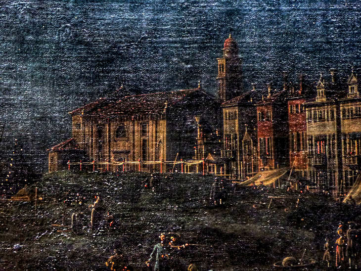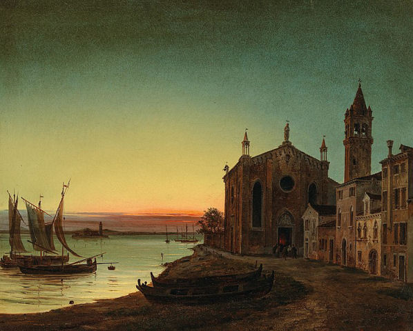 has a dome.Local colour A famous fair, celebrated on the eve the Feast of Saint Martha in August, involved fishermen roasting sfogi (flatfish) on the beach, dancing, and the mingling of the classes. There is a Canaletto painting of this fair, La Vigilia di Santa Marta, in the Gemäldegalerie in Berlin (see the hastily-snapped dark detail photo right). It is one of only two known Canaletto night-views, the other being La Vigilia di San Pietro, also in the same gallery. The church in art Apart from the rare Canaletto night view mentioned above there's a painting called The Giudecca Canal with the Church of Saint Martha (see below right) by Francesco Guardi from c.1770/80 in the Gulbenkian Museum in Lisbon. Also the Victoria and Albert Museum in London has a similar painted view by Giacomo Guardi, the son of Francesco, from the beginning of the 18th century. Luigi Querena painted Santa Marta at Sunset in 1859 (see below). He being the son of Lattanzio, the restorer, and painter of many altarpieces for Venetian