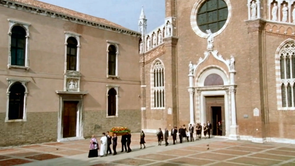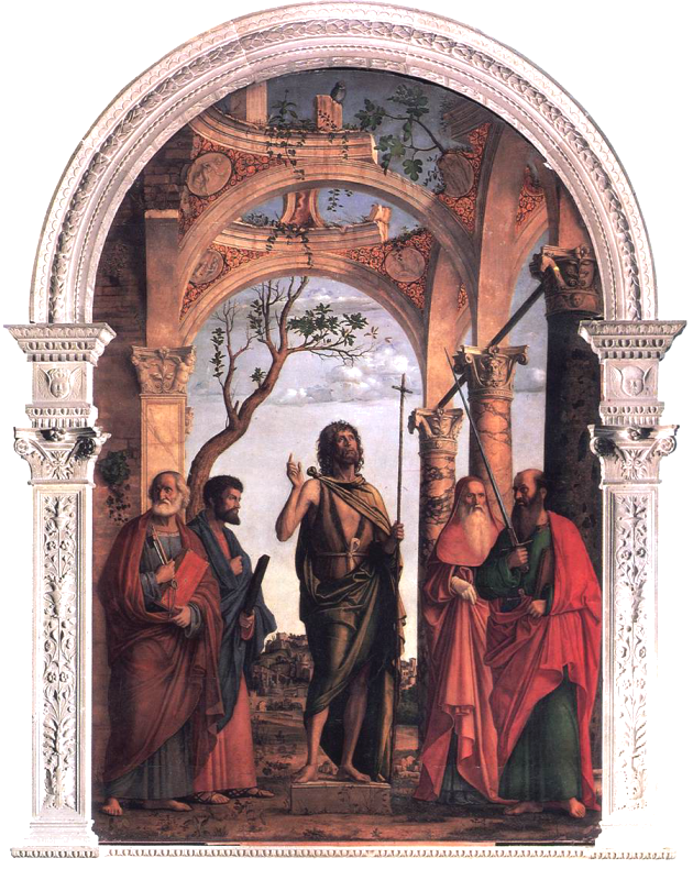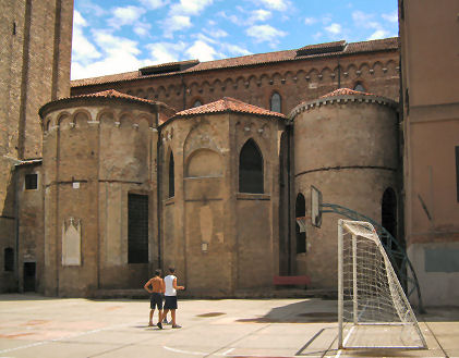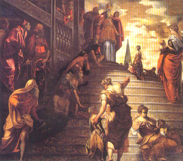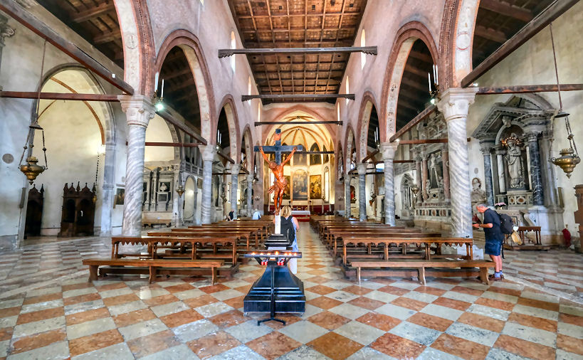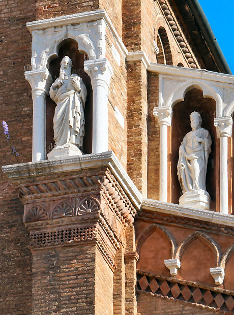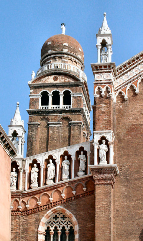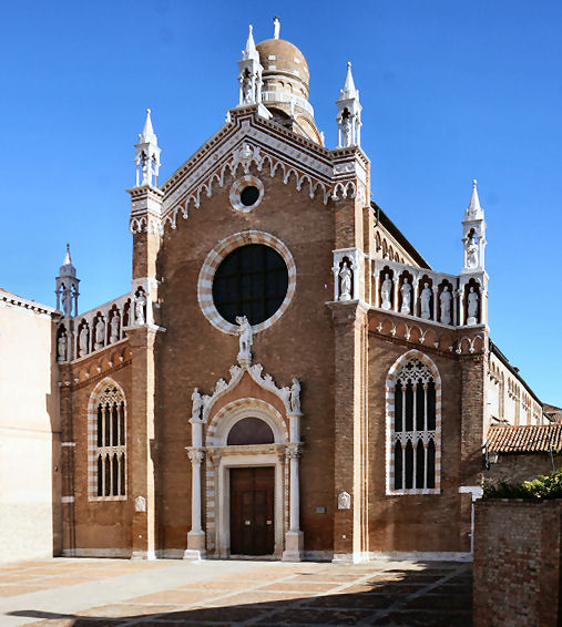 History A church and monastery were founded here around 1350 by the Umiliati order from Lombardy and initially dedicated to Saint Christopher, the patron saint of the gondoliers. Fra Tiberio of Parma, the leader of the Order, is said to have been responsible for the original design of the church and is buried here. During the building of this church an unfinished statue of the Madonna, made by Giovanni de Santis (but also said to have fallen from heaven) and kept in an orchard (orto) nearby following its rejection by the Prior of Santa Maria Formosa in 1377, for which church it had been carved, started getting a reputation for glowing and working miracles. The Scuola di San Cristoforo bought the statue, with the intention of thereby increasing offerings towards the cost of the building work, and on 18th June 1377 it was placed on the high altar. Since then the church has been known as Madonna dell'Orto. After a serious subsidence in the foundations at the North end of the church the order were given 200 ducats to rebuild. Reconstruction work from 1399 resulted in the complete redecoration of the interior and the construction of the new façade. A new and larger monastery was built at this time too. The Umiliati were expelled 1461 by the Council of Ten because of their 'depraved habits', the suppression of the order by Pius V following in 1571. The Canons of San Giorgio in Alga (also known as the Turchini because of their Turkish blue/green robes) replaced them (they being an order who didn't believe in building new churches but were committed to occupying old churches) and the restoration work was finished in 1473 with the completion of the façade. In 1669 Cistercians from San Tommaso on Torcello moved here, the Canons of San Giorgio having been suppressed by Pope Clement IX. In 1787, with only three monks living here, the Republic acquired the church and it was administered by the parish priest of San Marziale as an oratory. The church was allowed to crumble, with buildings being pressed into use as a stables, a hay and wine store and a powder magazine, until 1841 when some poor restoration (which included ripping up memorial stones, destroying the already damaged ceiling paintings, plastering over the façade and destroying the organ) was carried out under Austrian rule. It closed in 1855 but, after spending some time being used as stables, it was reconsecrated and reopened in 1868 as a parish church. (See H.Taine said below.) In 1931 the complex was given to the monks of The Congregation of Saint Joseph of Leonardo Murialdo from Turin, who still administer it. More restoration work was carried out in 1912 and in 1930-1931, when the 19th century interventions where reversed. But the great acqua alta of 1966 damaged the church further. Following this flood the church and its paintings were thoroughly restored by Venice in Peril between 1970 and 1980. The church The gothic brick façade is one of ![]() The churchyard The herring-bone patterned brick pavement, with Istrian stone pathway, is a rare survival from the days before Venetian campi acquired their now-ubiquitous stone paving. Interior Rows of slim columns of lovely striped Turkish marble separate the nave from the aisles, with archaic capitals, retained from the original church. Three chapels each side. Timber tie beams and a flat coffered wooden ceiling. Chunkier columns would have been needed to support a masonry roof. Art highlights From 1547 this was the parish church of Jacopo Tintoretto and his family - they moved from near San Cassiano to the Fondamenta dei Mori near here in that year. His ashes were interred here in the 19th century, along with those of his wife and eight more family members. You'll find his memorial stone in the chapel to the right of the chancel, which was previously the chapel of the Bonetti family, along with his painter offspring Marietta, who had died before him, and Domenico. He had originally been buried in the family tomb of his wife's father. There are 11 paintings by him here - only San Rocco beats this church for feasting on Tintoretto. A monumental pair, The Adoration of the Golden Calf and The Last Judgement both thought to have been painted around 1563, flank the altar, fitting exactly into their spaces, they were probably painted in situ. (It is said that amongst the bearers of the Golden Calf you'll find portraits of Giorgione, Titian, Veronese and Tintoretto himself.) The Five Virtues in the vault from c.1565 are by Tintoretto too, except the middle one, Faith, which is visibly by a different (17th century) artist, Pietro Ricchi from Lucca. The Presentation of the Virgin (see right) over the door to the Capella di San Mauro, is from 1553 and is more lovable. (Note the real gold leaf decoration on the steps.) It was painted to outdo Titian's huge painting of the same subject (in the Accademia) and even emulates the older artist's characteristic colour scheme. Tintoretto had lasted a mere ten days as Titian's pupil, for whatever reason, and they never became pals. The very-evident obelisk is also a steal from the Titian, but is also a not-unusual inclusion in paintings of this subject of this period, representing the sun and symbolising the triumph over death. The 15 steps represent the 15 psalms recited by pilgrims ascending to Jerusalem. This painting was once the outer doors of the organ, and is positioned where the organ used to be, with the two paintings currently either side of the high altarpiece The Beheading of St Paul and The Vision of the Cross to St Paul on the inside of the doors. The left-hand side of the church is dominated by works by Tintoretto's son Domenico which don't exactly shine and, in fact, a Palma Giovane Crucifixion in the Morosoni Chapel is the highlight of this side. In the first chapel on the right Cima de Conegliano’s fine Saint John the Baptist with Saints Peter, Mark, Jerome and Paul of 1493-5 (see below right) which is rare for being in its original sto