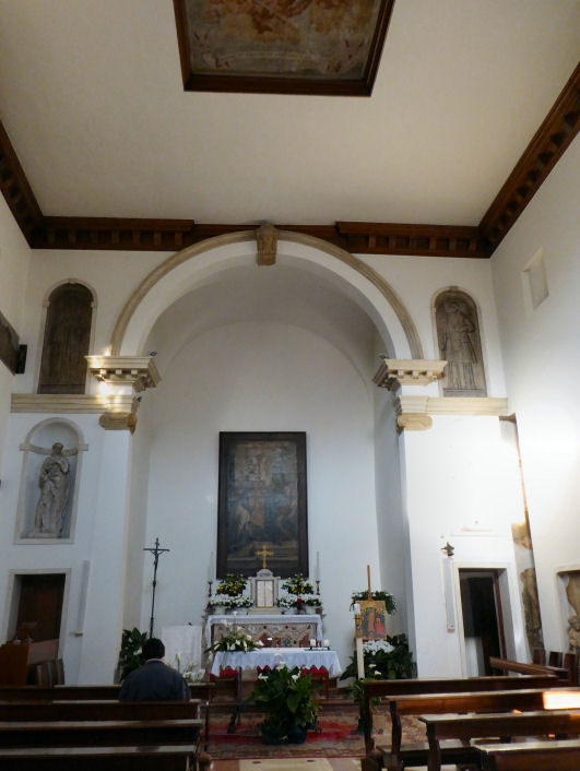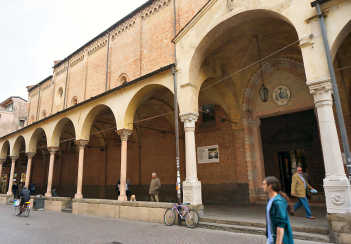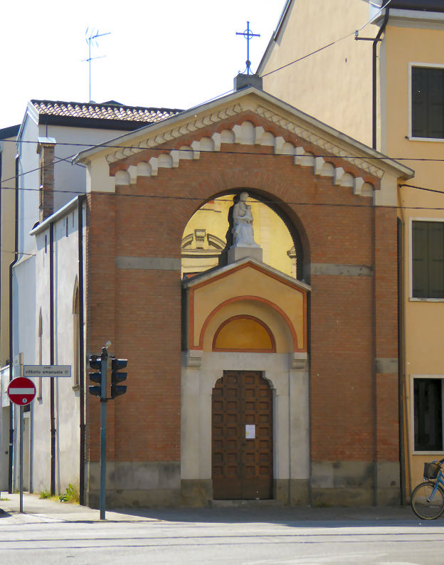 History Built from 1372, financed by Fina Buzzacarini, the wife of Francesco I da Carrara, who also commissioned Giusto de' Menabuoi to decorate the Baptistery of the Duomo as a mausoleum for the couple. The church was built on the site of the house of Niccolò da Carrara, which was demolished. Niccolò was the traitorous grandfather of Francesco I and the story goes that Fina, a very pious woman, chose to build on this site to punish him for his betrayal. Or it may have been to celebrate the marriage of one of her daughters. When Fina died in 1378 responsibility for completing the church passed t0 her sister Anna, the abbess of the San Bernadetto. In 1392 Fina's son Francesco Novello, who had succeeded his father as duke, gave the church to the Servites, which was when it acquired its current name. The Renaissance portico along the left side of the church was added in 1511 by Bartolomeo Campolongo, using ten red marble octagonal columns from the demolition of the original 14th-century chapel of Saint Anthony in the Santo. The church was part of a complex that included the convent of the Servites, the Oratory of Saint Homobonus and the Oratory of the Guild of Saint Mary of the Servites. Confiscated in 1806, the government only returned the church to ecclesiastical authorities in 1963, 157 years later, as a plaque in the church records. Interior Aisleless and quite tall with white walls, a wooden corbelled roof and some unspecial monuments to worthies and a nice variety of 14th-16th century fresco fragments spaced around. The 16th-century fresco of the Virgin and Child with Saints Roch Anthony Joachim and Anna on the back wall to the right is the most complete. It is now attributed to Dominico Campagnola (previously it was said to be by Girolama del Santo) and dated to the 1530s but looks to have suffered some inexpert touching up. The two frantic 17th century canvases above are by Matteo Ghidoni. The dominant feature is the very Baroque Altar of Our Lady of Sorrows which faces you as you enter the side door (see photo right). It is by Giovanni Bonazza from 1703-10 and houses a statue of The Virgin from the late 14th century by Rinaldo di Francia. It was previously erroneously attributed to Donatello. There's a small 'Scuola di Mantagna' Pieta fresco contained in a Lombardesque tabernacle to the right of the baroque altar, it was previously said to be by Jacopo da Montagnana, a Paduan painter who Vasari said studied with Bellini, but whose work indeed looks more influenced by Mantagna. It is now said to be by Pietro Calzetta (1430/40-1486) and is called The Man of Sorrows (Christo Passo) Between the Virgin and St John. There's also God the Father in the lunette above. There's a polygonal apse with two square side chapels. Flanking the apse are canvases of Saint Andrew and Saint Peter by Palma Giovane. In the chapel to the left of the apse is a Crucifix, recently restored. The church now says that it's by Donatello, other sources have said that it's by an unknown artist inspired by Donatello, but recent scholarship seems to go with the Donatello attribution, made during the decade he spent working at the Santo. The face looks very Donatello. It was painted to simulate bronze in the 19th century but restoration 2012-2015 restored the flesh tone. It is venerated, though, because in 1512 blood is said to have seeped from the face and side of the statue. Originally it stood on the tramezzo (rood screen) but was moved to its current position after the bleeding episode and ![]() Lost art An altarpiece showing the Virgin Misericordia, with the Child and Saints, by an anonymous Paduan artist of the late 15th century, is in the Eremitani Civic Museum