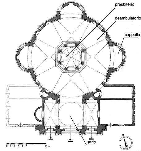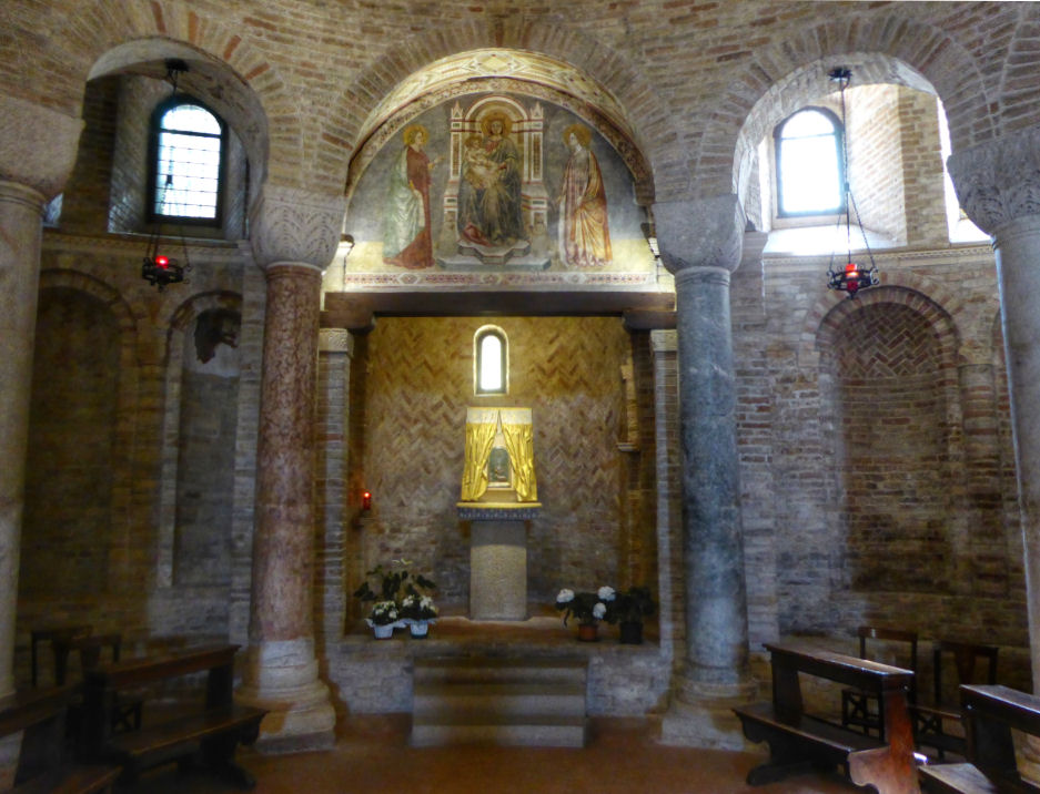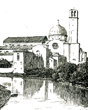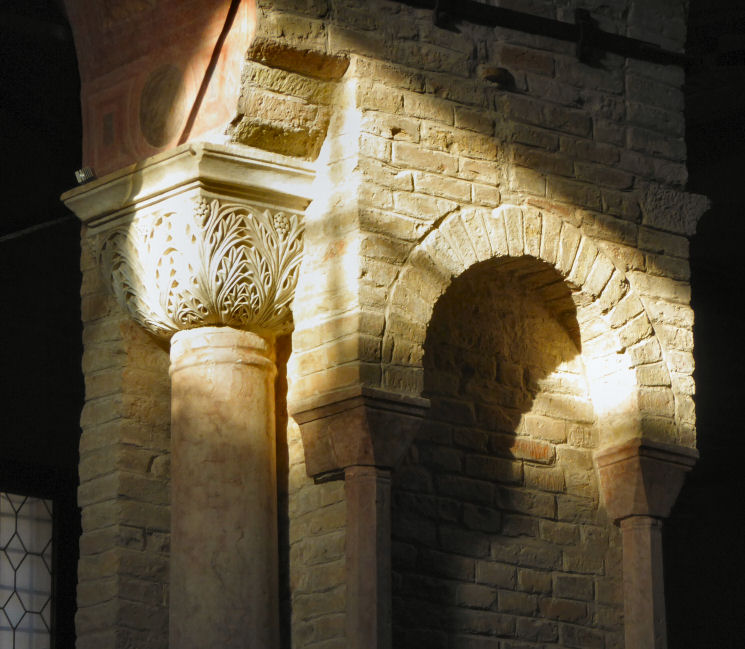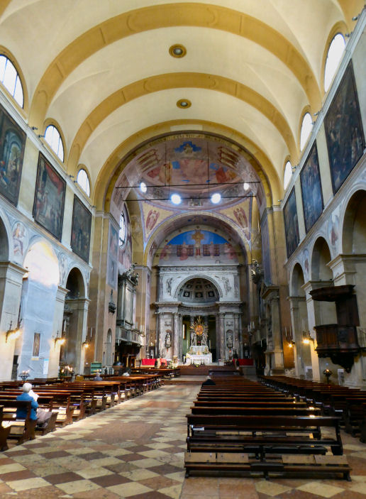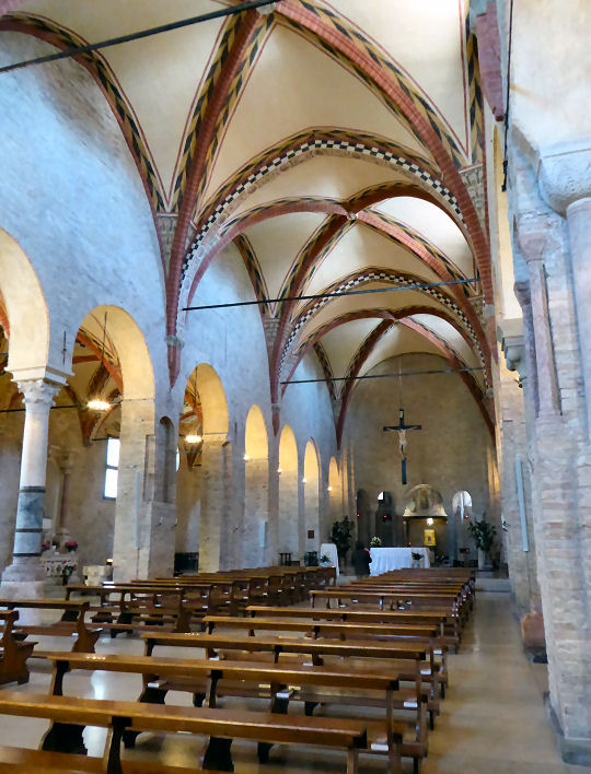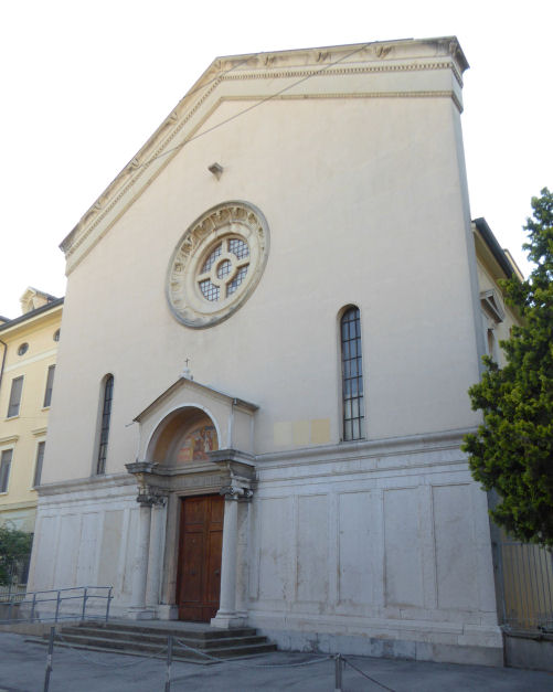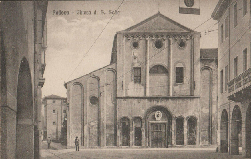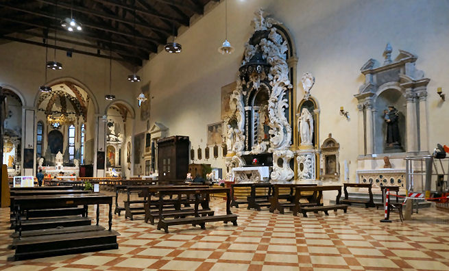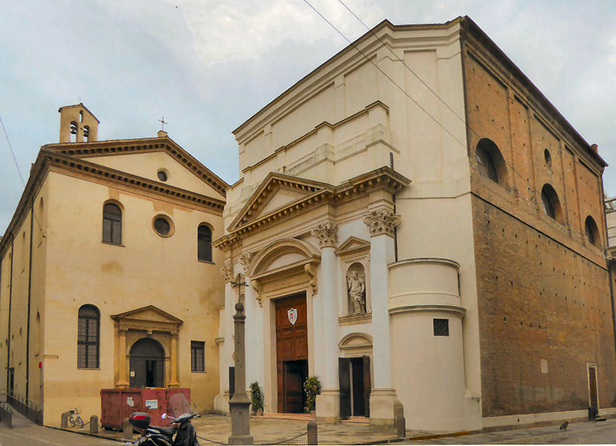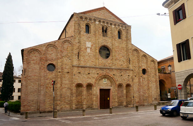 ![]() Various traditions have it that this is the site of the oldest church in Padua, founded by Saint Prosdocimus, the first bishop of Padua, in the 4th century, or that it was founded in the 8th or 9th century, on the site of a temple to Mithras, or maybe Apollo, and that it was the original cathedral of Padua. It was crumbling in 1106, though, and the current church is mentioned first in a document dated 9th February 1123 where Bishop Sinibaldo urges the speeding up of the building work, which had begun in 1109 and suffered delays following the earthquake of 1117. Work was completed in 1127 with a Romanesque facade but retaining the earlier church's apse parts of which were found, in the crypt, to date to the 9th century. There were 14th century Gothic additions too, and much restoration, including the removal of a building which was 'leaning on it' in the 1950s. This major work was to restore the church to its original appearance, removing mannerist and baroque decoration. Until 1957 the church housed the relics of the Blessed Beatrice I Este (1578) and of the Blessed Elena Enselmini, the latter having been moved here from the church of the Blessed Elena in 1810. Initially run by Augustinians monks, the church had passed to Benedictine nuns by 1517. In the 16th century it became a parish church. The nuns were expelled during the Napoleonic suppressions in 1806–1810 and the convent was acquired by the state. The church has recently returned to being a parish church governed by the secular clergy of the Diocese of Padua. The façade A thing of niches, blind arcades and hanging arches (it might remind you of Torcello) it dates to the early 12th century. Some niches have fragments of 14th-century frescoes. The mullioned window at the top is from the 20th-century restoration, the large oculus being 14th century and part of the work instigated by Bishop Stephen from Carrara. . Interior Pale brick and plain, with a nave and two aisles separated by rows of pillars, columns on pillars, and two columns - they vary much but match across the nave. A groin-vaulted ceiling of the 14th century, with decorated ribs and arches. Two side altars each side. The result of the major restoration in the 1950s which returned the building to its original appearance, removing 16th and 17th century accretions. The plastered roof dates from the late 14th century renovation work A burst of fresco in the vaults over the left-hand aisle of the ambulatory. Some 13th/14th-century anonymous fresco fragments, including a 14th-century lunette of the Virgin and Child Enthroned with Saints and Donors over the apse (see photo below right). The deep early-medieval apse was restored in 1852 and has an ambulatory which narrows to nothing at the back. A Vision of San Francesco di Paola by the Paduan artist Giovanni Battista Cromer (1665 - 1745) was restored in 2002. It sits over the altar dedicated to the Blessed Beatrice D'Este in the right-hand aisle. In the left aisle is an altar with a Pietà by Egidio from Wiener Neustadt. Campanile Romanesque/Gothic, dated 1296, adjacent to the apse. Two notable baptisms and a funeral The baptismal font here was used to baptize Livia and Gianvincenzo, offspring of Galileo Galilei. It was originally in the church of Santa Caterina. Also here is the tomb of the writer Ludovico Cortusio who in his will famously forbade his friends and relatives from weeping at his funeral, on pain of losing their inheritance, and promised that the one who laughed most would become his principal heir. He banned black drapes and stipulated flowers and greenery, music and minstrels to replace tolling bells. He ordered his bier, covered in bright fabrics, be carried by 12 young girls dressed in green and singing songs. He wanted all the town's monks to attend, except those whose robes were black. He died on 17th July 1418 and his wishes were carried out, giving the ceremony the appearance of a wedding rather than a funeral. Lost art An altarpiece, a Sacra Conversazione, painted for the high altar in this church in 1448 by Mantegna. It is said to have been his first commission and according to Vasari was painted when he was 17. Commissioned by the Confraternity of St Anthony on behalf of a recently-deceased baker called Bartolomeo, it was dismembered in the 17th century and is now lost. ![]() Opening times Mon/Tues 9.30-11.30, 16.00-19.30 Weds-Sat 7.30-11.30, 16.00-19.30 Sunday and feast days 9.00-12.30, 18.00-20.00 |