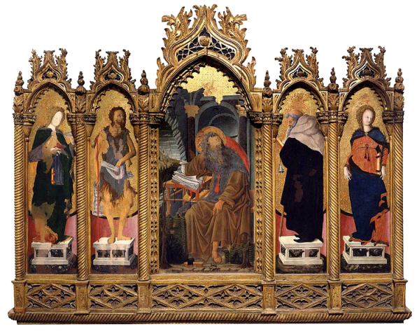 ![]() History The Carmelites were established around here, an area dominated by mills, in the later 13th century and work on their church here began in 1309, on the site of an oratory built in 1212. The original church had a single nave, a ship's-keel wooden roof and six chapels. In 1491 heavy snow and an earthquake caused the roof to collapse. Lorenzo da Bologna and Pietro Antonio degli Abati were employed to rebuild. The church was completed in 1523 by Biagio Biagio, the work retaining much of the original structure, with renaissance embellishments. (It is said that Lorenzo's dome is visible in Giorgione's Tempest.) Further damage, from an earthquake in 1695 (following which the roof was replaced and the façade, and main door were completed) and from fire following a firework display celebrating the new pope in 1800. Also bomb damage in 1917 by the Austrians (the dome was destroyed and rebuilt in 1931) and in 1944 by the Allies, the church being close to the railway station. Façade Another unfinished façade, punctuated by holes where the scaffolding poles were inserted, called putlogs in English, because that was where they put the logs to support the scaffolding. The doorcase dates to 1412, with statues by Bonazza added in 1736/7. Interior Big, tall and aisleless, barrel-vaulted with six substantial chapels down each side, variously (mostly baroquely) filled. Fresco roundels, mostly, in the spandrels on the wall between them. A huge triumphal arch over the high altar at the end of a deep choir which has a large frescoed cupola above on a shallow drum, with a deep lunette arch over the arch. The choir area is covered in frescos of Pre-Raphaelite appearance. No transept. The painted altarpieces inside the chapels (the first and third on each side) and the panels elsewhere (large and square over each chapel and on the back wall) are mostly 17th century and not special. Many are by Bissoni and Varotari (aka Il Padovanino). The last altar on the right contains what is said to be one of the best by the latter: Christ with Zebedee's Mother, originally from church of San Giacomo. There are no labels on the art and no guidebook was available. ![]() Lost art The De Lazara Polyptych of 1449-52 (see right) signed by Francesco Squarcione, Mantegna's master, is now in the Padua Museo Civico. It's one of the rather second-rate painter's better works, made for Leone de Lazara's family chapel here. The central panel shows Saint Jerome in his Study, with four side panels showing saints against a gold ground - Lucy, John the Baptist, Anthony Abbot and Justina of Padua. The church in art This church can be seen. in the far distance, in the centre of Canaletto's The Porta Portello, Padua of c.1741/2, now in the Washington National Gallery.