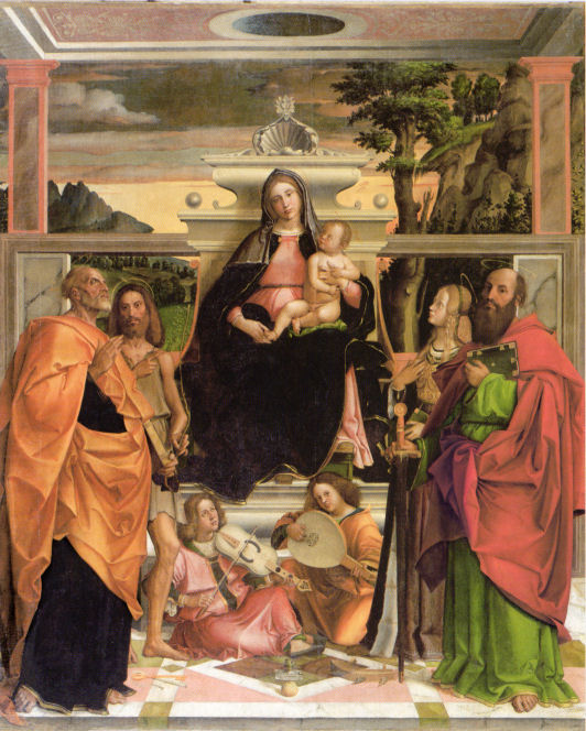 History A church was on this site in the 10th century, it is said, but the current church dates to Baroque rebuilding in the 18th century. Interior A not very long - almost square - nave, with an altar and two confessionals each side, a square choir, stone saints in niches and long canvases in the choir of the Resurrection and ?Saint Lucy. A painting of Saint Luke as a painter, attributed to Giambattista Tiepolo, is reported to be here, but was not to be seen on my visit. Lost art Benedetto Diana's Virgin and Child Enthroned with Saints Jerome, Benedict, Justina, and Mary Magdalene (see below), now in the Accademia in Venice, acquired, following the Napoleonic Suppression, in 1812. A carved lunette of the Virgin and Child by the studio of Pietro Lombardo is in the Eremitani Civic Museum. ![]()