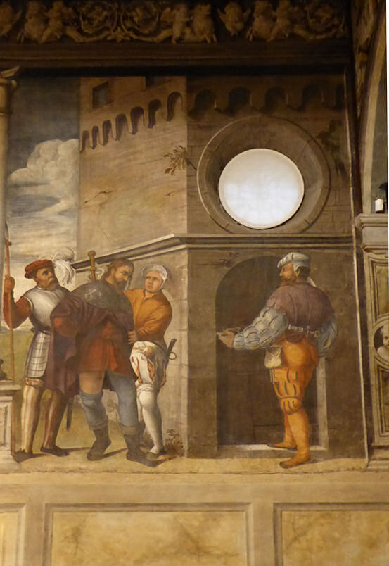 ![]() ![]() History Renaissance in style, built in 1436 at the expense of Domenico Campolongo, a Paduan nobleman, and enlarged in 1525. Art In the refectory here, a large Crucifixion by Michele da Verona dated 28th March 1505, itself a smaller version of a work of 1501 in San Giorgio in Braida in Verona, both commissioned by the Secular Canons of the Blessed Lorenzo Giustiniani. Impressive frescoes by Domenico Campagnola, a Paduan pupil of Titian. Two(?) paintings by Bartolomeo Montagna, one being the Virgin and Child Enthroned, with Saints Peter, John the Baptist, Catherine, Paul and Angel Musicians (c.1512) over the high altar (see left) which was restored in 2002. It also has wings depicting Saints Lawrence and Francis. An Entombment, signed by Jacopo Bassano and dated 1574 on the stone, bottom centre, over the last altar on the left wall. A Sacra Conversazione by Antonio Vassilacchi, the Greek painter and pupil of Paolo Veronese, also known as L'Aliense (the alien) who worked mostly in Venice, especially in the Doge's Palace after the 1577 fire. |