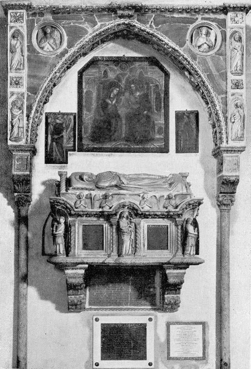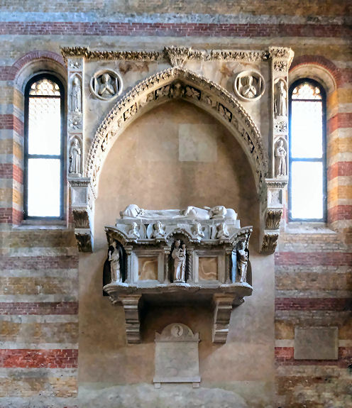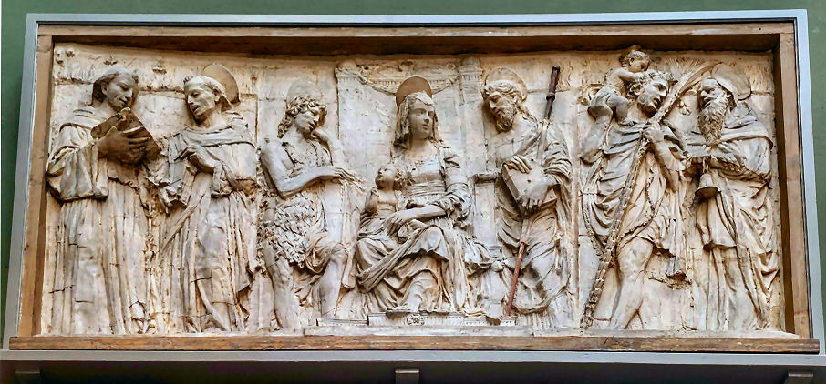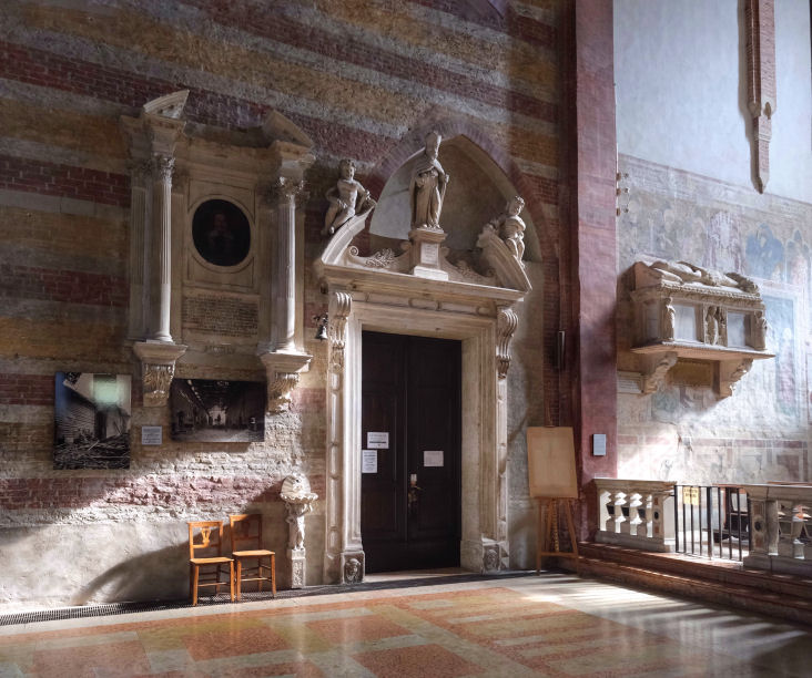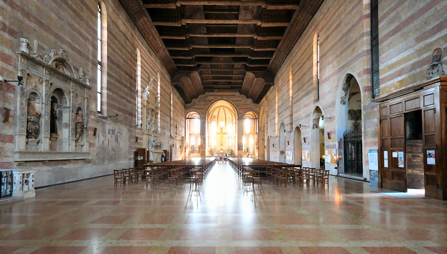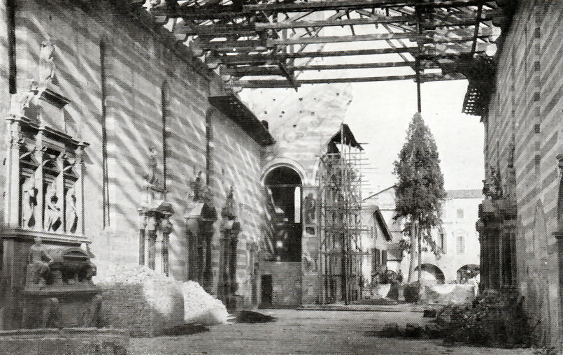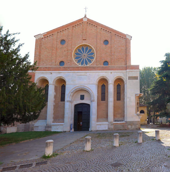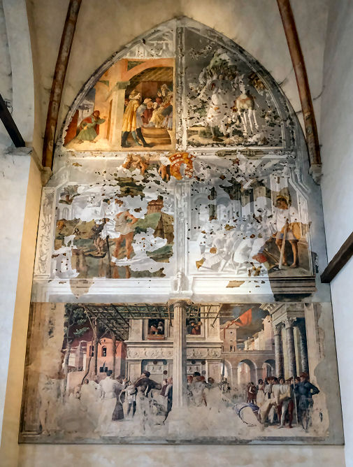 History Built from 1276 and, like the previous church on the site, built by the mendicant order of Augustinian Hermits and dedicated to the Apostle saints Philip and James. The church is known as the Eremitani after their adjoining monastery, which now houses the municipal art gallery and the Scrovegni chapel ticket office. Work was completed in 1306 with Fra Giovanni degli Eremitani's ceiling and façade. The Augustinians left following suppression by Napoleonic in 1806 . The church reopened as a parish church in 1808, with the complex becoming a military barracks, called the Gattamelata barracks. The church and former monastery were badly damaged by a stick of bombs on the 11th March 1944 carried out by the US 15th Air Force and targeting the railway and goods yard. Heavy damage saw the upper façade, the ceiling and parts of the apse end completely destroyed, including the Dotto and Ovetari chapels. Much restoration work followed, directed by Ferdinando Forlati. Exterior The façade was added in 1306, with the church consecrated in 1435. The loggia is later. The side entrance is known as the Door of the Months as it has four panels attached to its pillars by sculptor Niccolò Baroncelli from 1422, consisting of 12 reliefs depicting allegories of the months. Interior The nave Coming through the door in the façade the church presents huge rectangular vista free of columns and with banded red, white a yellow brick walls. The ribbed ceiling of 1306 is by Fra Giovanni degli Eremitani, using timbers from the old wooden ceiling left over after the construction of his new ceiling of the Palazzo della Ragione, given to him by a grateful city. A guidebook of the late 19th century (by Augustus J. C. Hare) reports the the ceiling was at that time painted blue and white, spoiling 'what would otherwise be a striking and beautiful building'. ![]() Further along on the left are two large Nanto-stone architectural and polychrome terracotta sculptural altarpieces. The first is called the Dossale della Madonna and the five figures may be the work of Andrea Riccio; the other is the Dossale di San Nicola da Tolentino, with three figures by Domenico Boccalaro. Along the right hand side are four small chapels, the first one is the chapel of the Tebaldo Cortellieri who died in 1370, dedicated to Saint Augustine. It was redecorated in the 17th century but still contains traces of frescos by Giusto de' Menabuoi from around 1370, his first work in Padua, depicting Saint Augustine with the Virtues and the Liberal Arts. The chapel was commissioned by Traversina, the mother of Tebaldo who had been employed by Francesco (il Vecchio) Carrara as a judge and diplomat. The second chapel is dedicated to Saint Anthony Abbot and features very damaged frescoes by Guariento, the Paduan painter who also frescoed the presbytry here. In the forth there's a Head of Christ by him (?) on the underside of the arch, all that remains of a Flagellation, and there's a Virgin and Child Enthroned over the altar by Altichiero. The east end ![]() The Giottesque frescoes in The Presbytery (see photo below right and detail of Santa Giustina nearer right) are by Guariento di Arpo, a Paduan painter who became a kind of court artist to the Carrara, going on to provide panel paintings and frescoes for the Carrara Palace. He has other frescoes here, and some painted on the wall around the tomb of Doge Giovanni Dolfin in San Zanipolo in Venice, and the Sala del Maggior Consiglio in the Doge's Palace c.1365, the first time a painter not in the Venetian Painter's Guild had been given such a prestigious commission. This last work, including a large Paradise, were seriously damaged in the 1577 fire but discovered in 1903 under Tintoretto's Paradiso. The left wall here in the apse has his four panels showing Scenes from the Life of Saint Philip and two (at the bottom) Scenes from the Life of Saint Augustine. Below the narrative paintings are allegorical personifications of The Seven Planets and The Seven Ages of Man. The scenes on the right wall and vault were also destroyed in the bombing. They included a Christ Enthroned with Saints and scenes from the Lives of Saints James the Less and Philip, and have now been replaced with Guariento's earlier Coronation of the Virgin (see below) and his Portraits of Ubertino and Jacopo da Carrara of 1351, three detached fresco f ![]() To the left of the presbytery is the Sanguinacci family chapel decorated on the right wall by Giusto de' Manabuoi in 1373 (so an early work) with a Virgin and Child, Saints and Donor. The donor might be the German soldier Heinrich Spisser, who died in September 1373 in the employ of Francesco il Vecchio Carrara. (But some sources say that this Giusto-decorated chapel was destroyed in the 1944 bombing.) Over this fresco is another, a slightly earlier (1340s) Virgin and Saints by the anonymous Maestro del Coro Scrovegni. The two chapels to the right of the presbytery are the Ovetari and Dotto Chapels - see below. ![]() Lost art Very many damaged fragments of a fresco scheme of scenes from the Life of Christ (of the early 14th century) for a chapel of the cloister here by Pietro and Guiliano da Rimini are now in the room with the Giotto Crucifix in the Civic Museum next door. There's also a damaged fragment of a fresco of Saint Augustine by an anonymous artist from the Veneto in the same museum. A plaster cast of a relief showing the Virgin and Child with Saints Dominic, Peter Martyr, John the Baptist and James the Greater is in the Victoria and Albert Museum. The terracotta original (the Pala Ovetari) from 1448/50, by Giovanni di Francesco da Pisa, with traces of paint and gilding, is still in the Ovetari Chapel here, but following the 1944 bombing the cast is in better condition. A short sad story On Christmas Eve 1585 the body of Vittoria Accorambuoni, the beautiful niece of Pope Sixtus V, lay in state in this church, with the body of Flaminio, her younger brother. They had been mu