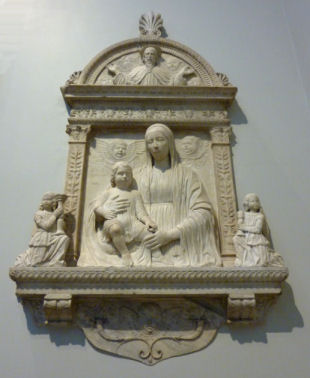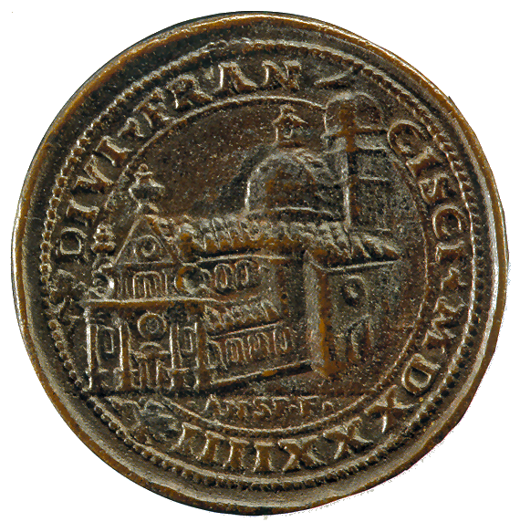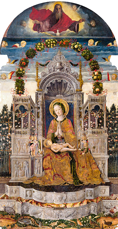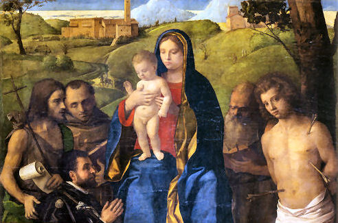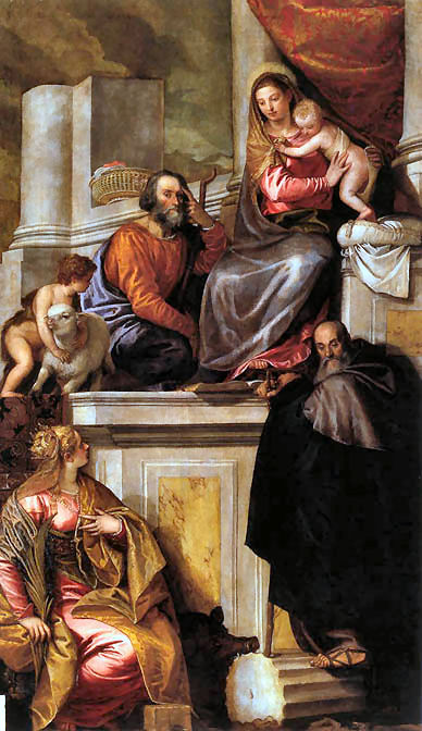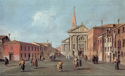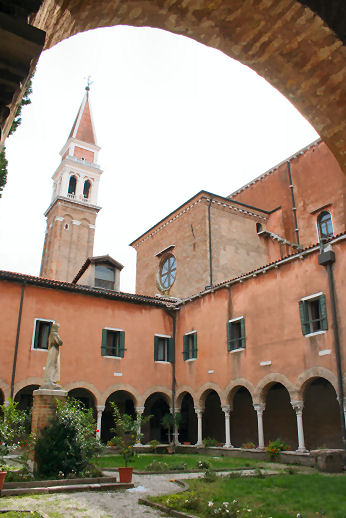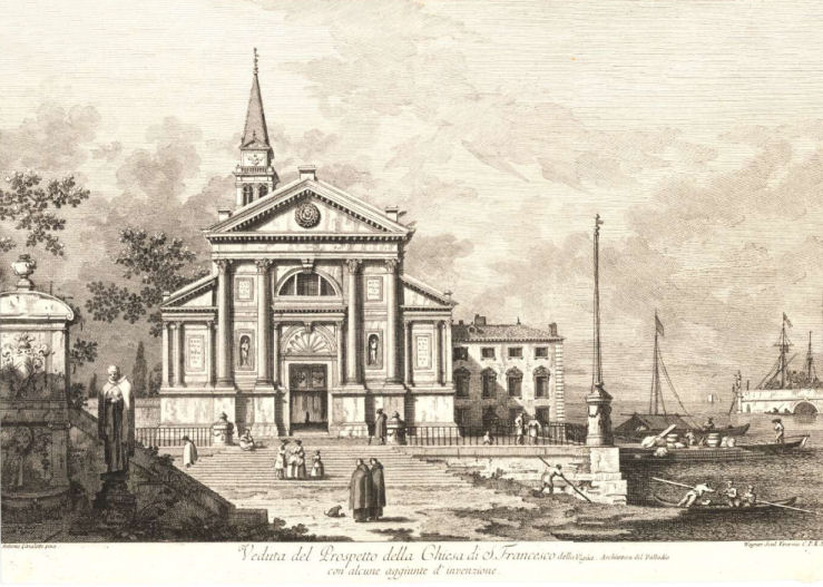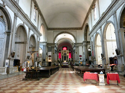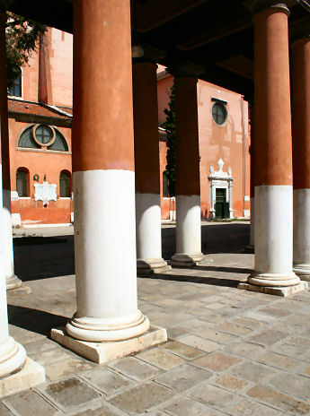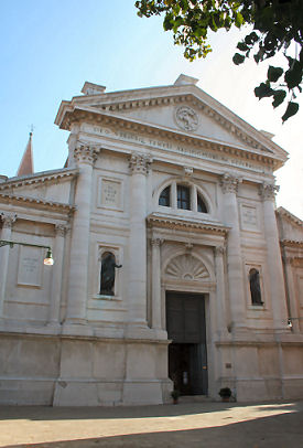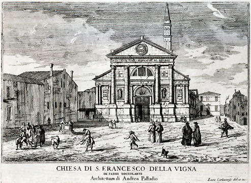 History This church was built where, tradition says, Saint Mark was driven ashore by a storm on his way back from Aquileia. Here he was told by an angel that the Lagoon was to be his resting place and that 'the city that shall rise on these lagoons will call you its protector'. The original medieval church was built by Franciscans in 1253 on the site of a chapel in a vineyard (vigna). This church can be seen now only on Barbari's map of the city. Some sources claim that this original small chapel survived until 1810. Beginning with his laying of the foundation stone on August 15th 1534, Doge Andrea Gritti sponsored a reconstruction (to designs by the Florentine Jacopo Sansovino) with the intention of revitalising the area. Work was substantially completed by the end of 1554, and the choir in use, although consecration wasn't until 1582. Sansovino created arguably the first Venetian Renaissance interior, but failed to complete the façade. His original design is now only preserved on a medal (see above) with Gritti's profile on the obverse, which shows the dome originally planned but never built. When Gritti died in 1538 he was buried near the high altar here. His place as sponsor was taken in the 1560s by Giovanni Grimani, patriarch of Aquileia, who paid for an Istrian stone façade from Andrea Palladio, Sansovino's design now being thought old-fashioned and lacking the necessary magnificence. This was to celebrate Grimani's appointment as a cardinal, an event which never happened. It was Palladio's first-completed church façade, erected 1564-58, and the only one completed in his lifetime. He had hoped that the building which half obscures his façade would be demolished, but it wasn't, and so the façade can only be appreciated partially or obliquely. In the mid-1990s it was found to be falling away and was reattached and restored by Venice in Peril. The church had suffered bomb damage in 1917. The Palladian-style gallery supported on columns, which is usually one's first view of this church (see photo below) as you approach its south side was built in the mid-19th century by Alvise Pigazzi. It linked the former Convento delle Pizzochere to the west, which was acquired by the Observant Franciscans in 1838, with the Palazzo Nunciato of 1535, which was given to the Papal Nuncio after the Palazzo di Venezia was received from Pius V. This palazzo had previously belonged to Doge Andrea Gritti, who is buried in the church. (The palazzo's housing the Papal Legate is commemorated by the nearby Salizzade della Gatte, or alley of the female cats, a clever corruption: la gatte/legate, you see?) Both buildings were taken over by the Italian government in 1866 for use as a military tribunal. The church ![]() The interior is in the shape of a Latin cross with a single nave and no aisles, but with deep side chapels. The harmonious and plainly pleasing interior is in keeping with the austerity of the Observant Franciscans' beliefs - they came here after a schism with the Frari Franciscans in 1517 - and is said to derive from Prior Francesco Zorzi's study of neo-Platonic proportions and his consequent adjustment of Sansovino's plans in order to reflect these proportions. They were adjusted to conform with the sacred geometry of the number three, reflecting the Trinity, as set out in the ex-nobleman Friar Zorzi's De harmonia mundi totius of 1535. (This book remained a standard work of Renaissance occult philosophy for a century, but has never been translated into a modern language.) The Ark of the Covenant and The Temple of Solomon were made to the same proportions, or so the theory goes, and there's a relationship to Kabbalistic theories of musical harmony in there too. But elsewhere you might read that Sansovino himself, influenced by his friend Titian, planned the church to reflect the mystic properties of the number seven. The plain barrel-vaulted ceiling lacks the dome which was planned by Sansovino but never built. Putting the monk's choir behind the altar was an innovation of his later adopted by Palladio. Interior and art highlights There are five chapels on each side of the nave, some more decorated than others, but most very plain and Franciscan, the better to show off the colours of their altarpieces. By the 16th century churches were no longer being built with screens between the nave and choir, although the earlier church here probably had one, so this has the typical Palladian retrochoir for the friars behind the high altar. Left side The first chapel on the left is very finely frescoed by Battista Franco (called Il Semolei) with an Adoration of the Magi over the altar by Federico Zuccari. The third on the left is a shiny white marble box with much carving, and some trompe l'oeil figures in the pendentives by Tiepolo. The ceiling, which looks like the work of Tiepolo too, is actually by Girolamo Pellegrini. The Giustinian chapel, fifth on the left, contains Paolo Veronese's Virgin and Child Enthroned with the Young John the Baptist and Saints Catherine and Anthony Abbot (see below right) an altarpiece that is well worth some money in the light, and a linger. It was his first major commission in Venice, painted around 1551, four years before he settled here. Its pyramidal and asymmetrical structure shows the influence of Titian's Pesaro Altarpiece in the Frari. The yellow marble panels in the painting reflect floor panels in the chapel. You might also notice the unusual detail of Saint Anthony's pig attribute chewing on a fallen column. The Priuli Chapel in the left transept contains the stone where Santa Giustina knelt for her martyrdom, in the right wall, and in a glass case the body of Santa Cristina, martyred at 13 in 297. The stone and the relics came here from the church of Santa Giustina when is was suppressed in 1810. The sacristy (through a door in the left transept that also takes you to the Capella Santa) contains a Sansovino altar and some not-great paintings. The Capella Santa 