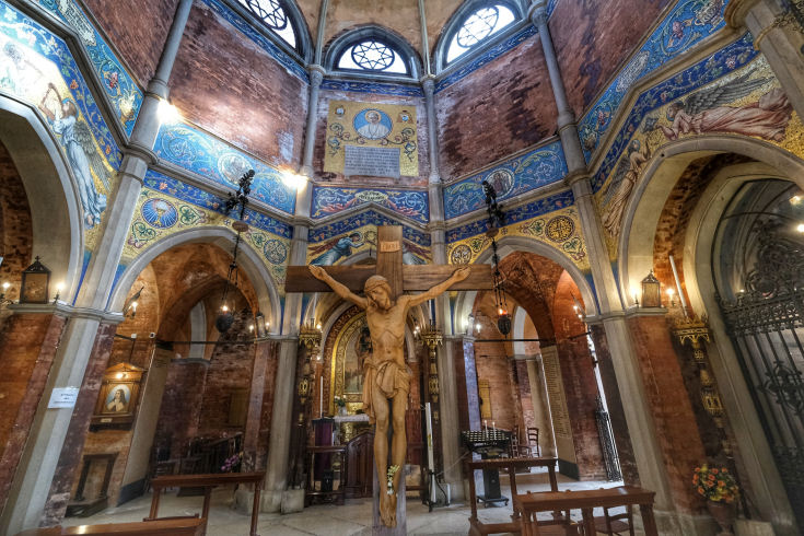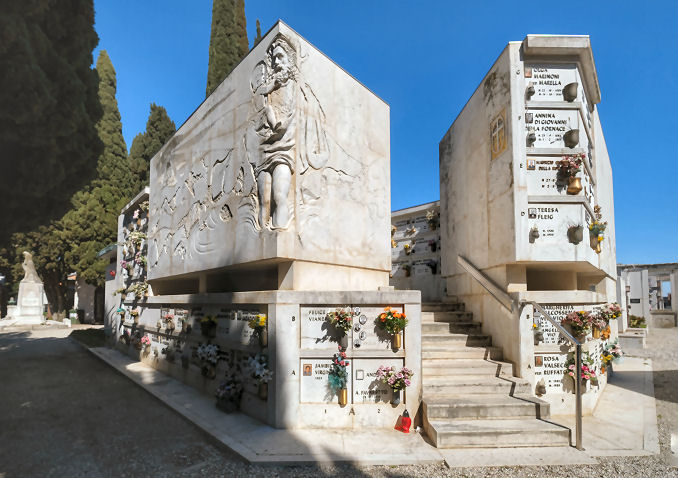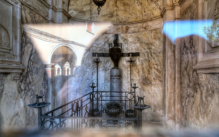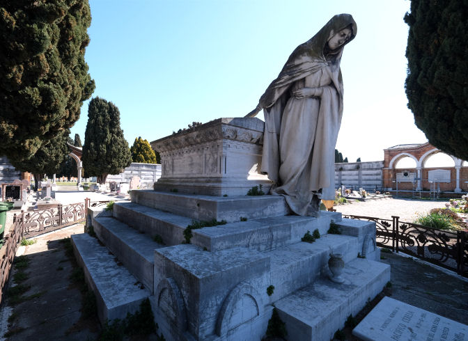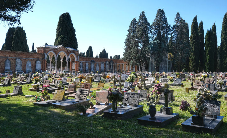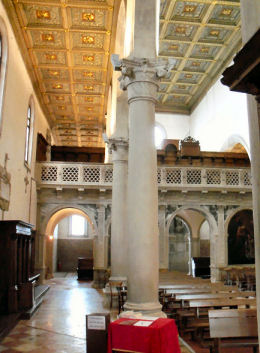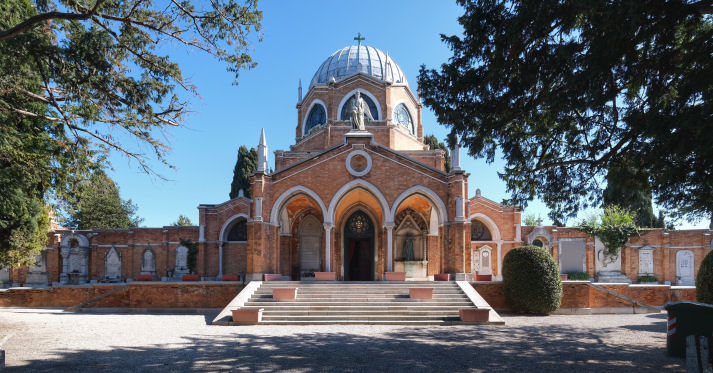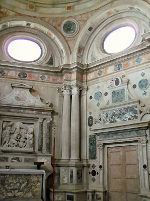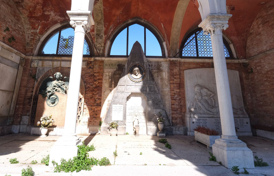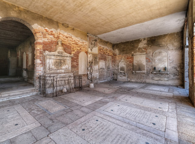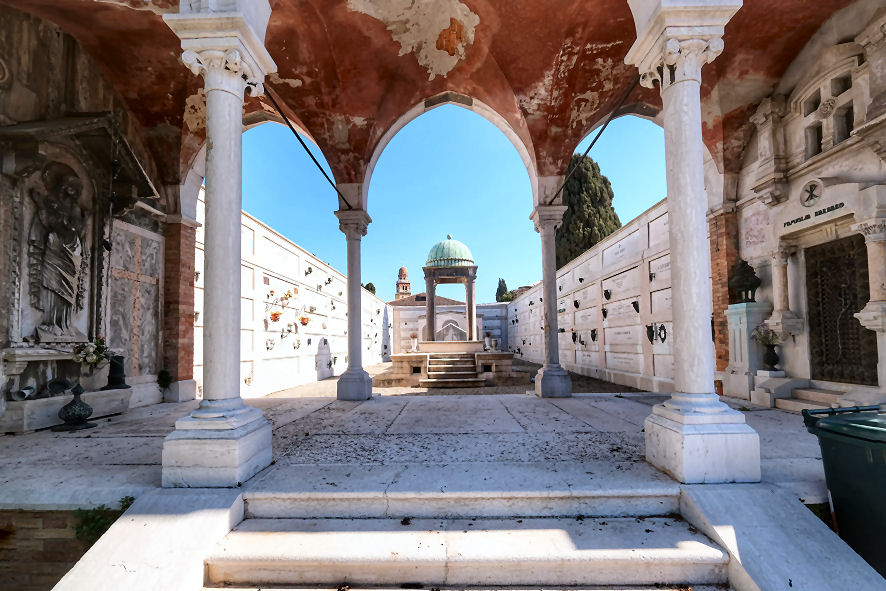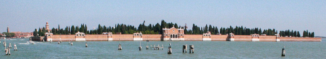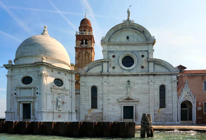 ![]() The original church was founded in the 10th century and dedicated to to the Archangel Michael. A monastery was built too and housed monks of the Camaldolesi order from 1212 to 1818. Amongst the monks who lived here were Fra Mario Capellari, who became Pope Gregory XVI, and famed cartographer Fra Mauro - there's a Fra Mauro Crater on the Moon named after him. (See far below right for an image of his mappamundo.) The church was enlarged and consecrated in 1221. Rebuilt in its current form 1469-78 by Mauro Codussi, who had previously worked for the Camaldolesi in Ravenna. This was his first building in Venice, begun when he was in his late 20s, and Venice's first church in the Renaissance style. The design of the façade and its use of Istrian stone solely was very influential on Venetian church architecture. The hexagonal Cappella Emiliana (see photo right) to the left of the façade was funded by the will of Margherita Vitturi, the widow of Giovanni Emiliani, who was the son of Bishop Pietro Emiliani of Vicenza who has a monument in the Frari. Thomas Coryate in his Crudities of 1608 describes Margherita, who was the sister of humanist Daniele Vitturi, as a 'rich courtesan' who 'hoped to make expiation unto God by this holy deed for the lascivious dalliances of her youth'.) It was built 1529 to c.1535 by Guglielmo dei Grigi and repaired by Sansovino in 1560-62. The gothic doorway to the right of the façade leads to a 15th century cloister (see photo below right). In 1835-39 the wide canal which divided the islands of San Michele and San Cristoforo was filled in to enlarge the cemetery founded on the latter island by Napoleon in 1807 (see below) and the monastery here passed to reformed Franciscans. Interior Restrained and basilical, with flat coffered ceiling and a gallery (see photo right.) There's a modest monument inside the vestibule (with his ashes) to Paolo Sarpi. Also a monument to Andrea Loredan, a benefactor, in the chancel. Ruskin wrote The little Cappella Emiliana at the side of it has been much admired, but it would be difficult to find a building more feelingless or ridiculous. It is more like a German summer-house than a chapel, and may be briefly described as a bee-hive set on a low hexagonal tower, with dashes of stonework about its windows like the flourishes of an idle penman. The cloister of this church is pretty; and the attached cemetery is worth entering, for the sake of feeling the strangeness of the quiet sleeping ground in the midst of the sea. Campanile 40m (130ft) electromechanical bells Built between 1546 and 1560, an unusually complex design in brick with relief decoration and a terracotta lantern and dome with a stone pinnacle. Lost art A lot of Bellinis have passed this way! The Priuli Triptych of 1510-12 (see below) was painted for the Chapel of the Cross here, built for Pietro Priuli, who died in 1493. The central panel of the Virgin and Child is flanked by two panels - Saint Peter and a Camaldolese monk on the left, Saint Mark and another monk, plus the kneeling donor, on the right. It's a work that always had and studio added to Bellini's name, and some recent scholarship has given it to Bellini's friend and collaborator Vittore Belliniano. It's now in the Kunstpalast in Düsseldorf.