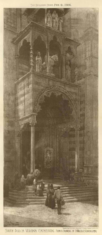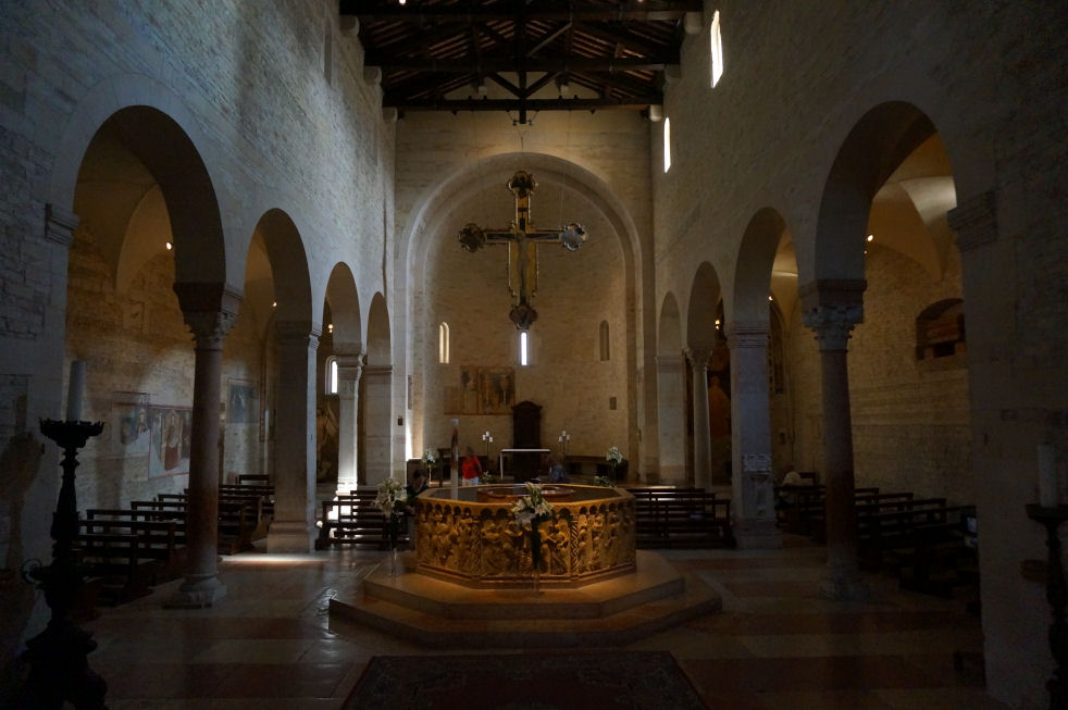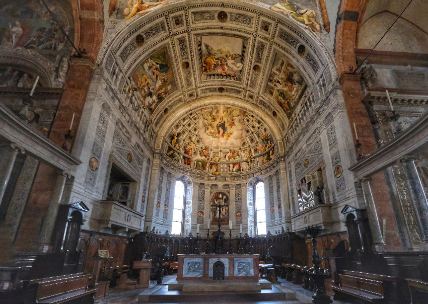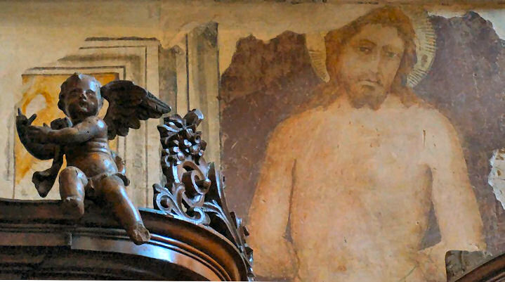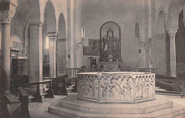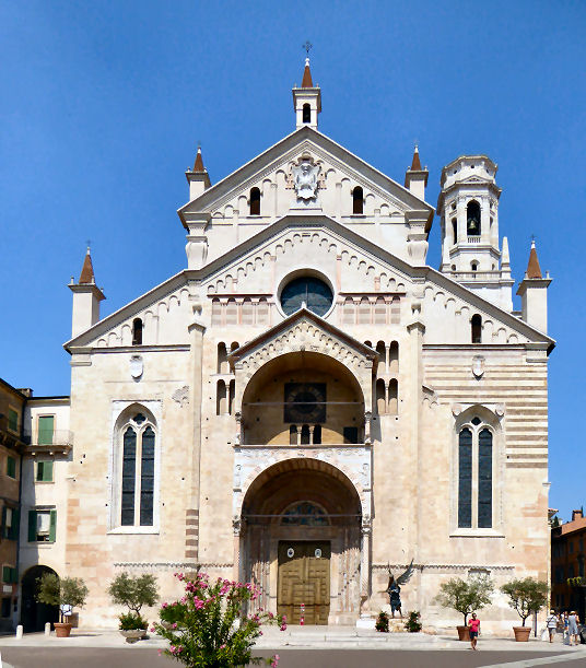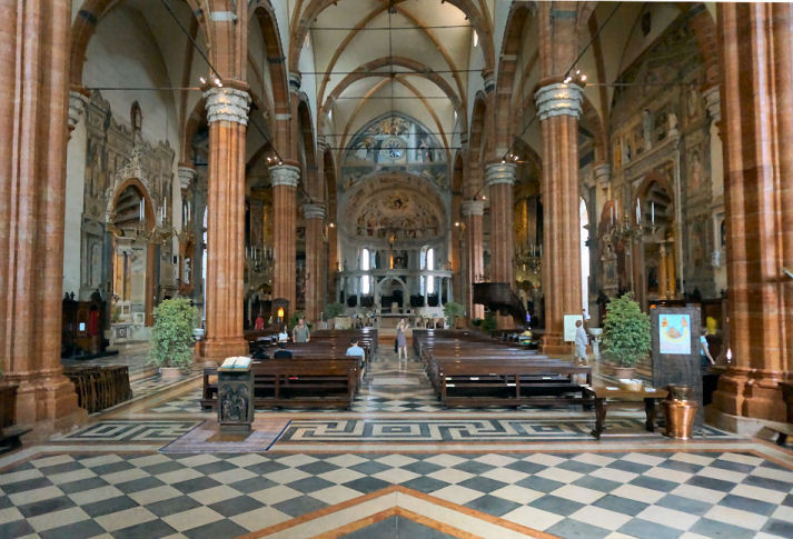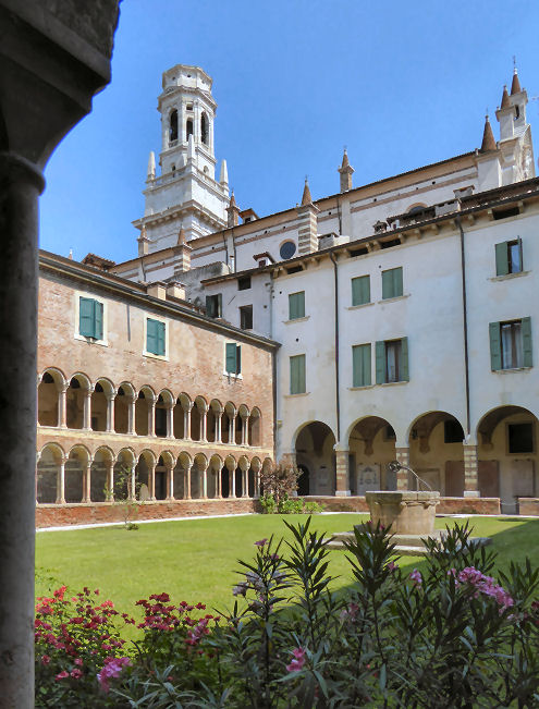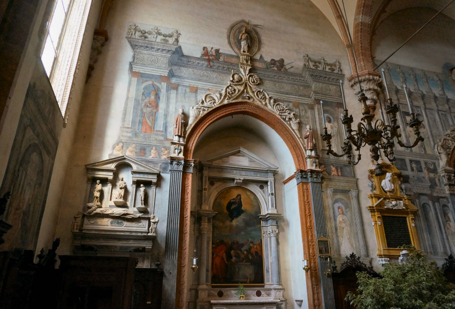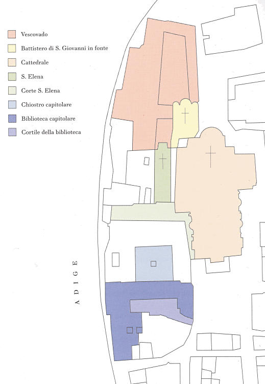 ![]() The first Christian basilica was built on the site currently occupied by the adjoining church of Sant'Elena. This first building was consecrated by St Zeno between 362 and 380, but it soon became too small and a larger basilica was built. Remains of the first of these early churches can be seen under St Elena, remains of the second can be seen beneath the cloister. This second building collapsed during the 7th century, possibly due to fire or earthquake, and the 8th-9th century (Carolingian) replacement was built on the site of the current church. This church was itself damaged by an earthquake in 1117 and a new one soon built, at the instigation of Bishop Bernardo, which was finally reconsecrated by Urban III on September 13th 1187. This church, the current building, was called Santa Maria Assunta and built further south than the previous churches, on the site of a church dedicated to Santa Maria Matricolare, of which no archaeological traces have been found.The interior was rebuilt in gothic style from 1444 into the 16th century when the aisle-divisions, side chapels and the choir screen were built. ![]() The main doorway and its two-storey prothyrum is the work of Master Nicolò, the 12th century sculptor who also carved the façade of San Zeno and worked on the façade of Ferrara's Duomo. Two arches containing sculptural reliefs are supported on columns with statues with griffins at the base. The two large Gothic windows either side were inserted during the 15th century work. The lunette features 13th-century polychroming and depicts The Annunciation to the Shepherds and The Adoration of the Magi with The Virgin and Child Enthroned in the centre. The side entrance porch (see the old print left) has sprightly work attributed to a 12th-century sculptor called Pelegrinus. Interior A nave and two aisles divided by tall columns of clusters of small columns in red Verona marble. This is a church with fewer side chapels than you'd think, because they're all big and each has lots of surrounding frescos conforming to a type representing monuments with statues. Also not the brightest church due to mostly small clerestory windows. The floor dates to 1880. The first chapel on the left, the Cartolari Nichesola, contains a somewhat restrained Assumption by Titian of c. 1530, his only work in Verona, it was looted by Napoleon, but was later returned and restored. It's not a patch on his earlier monumental Assumption in the Frari in Venice for complexity and dramatic colouring. The surrounding chapel (see below right) was renovated for the Nichesola family around the same time by Jacopo Sansovino, who is said to have been an intermediary in the purchase of Titian's altarpiece. The frescoes on the wall are late 14th century. The second chapel, the Abbazia-Lazzari, has late 14th century wall frescoes by Antonio Badile. The fourth chapel, the Chapel of the Madonna del Popolo, is deeper, almost making a baroque transept with the chapel opposite. It is a site of local popular veneration, housing a recent Madonna, made by Venetian sculptor Vincenzo Cadorin in 1920. It also has a reliquary urn containing the thorn with which local martyr saints Fermo and Rustico were killed. Just before this chapel is the (ever closed) door to the Sacristy of the Canons of 1625. The ceiling is decorated with a stucco scene depicting the patron of the Chapter, St. George Killing the Dragon, attributed to David Reti. The altarpiece is The Virgin and Child by Claudio Ridolfi. ![]() The organ on this side is decorated with paintings by Felice Brusasorci - Four Veronese Bishops and a Dormition on the doors and Old Testament Stories on the balustrade. Under it is the door which opens into a Romanesque atrium of Santa Maria Matricolare which leads, straight on, into the church of Saint Elena and to the right, passing the toilets, to the Baptistery. Sant'Elena (see photo right) is reached by passing over the excavated remains of the early 4th-century basilica. Standing on the site of the original 4th-century church, Sant'Elena is a single nave space renovated after the earthquake of 1117. Most of the floor of the presbytery has been removed to reveal the mosaic floor of the earlier church. The altarpiece from 1579 depicts The Virgin and Child Enthroned with Saints Stephen, Zeno, George and Helen by Felice Brusasorci. The nave has 18th-century altars with contemporary altarpieces. The gallery at the back has worn trompe l'oeil balustrade. The outside wall has an inscription stating that Dante, here at the invittion of the Scaligers, read his first oration, the famous Question of Water and Earth (Quaestio de acqua et terra) beneath the 15th century portico here in 1320. The Baptistery, called San Giovanni in Fonte, (see photo below) was rebuilt around 1123 in Romanesque style on the site of the original 8th-9th century baptistery. It is basilical, with a nave and two aisles, unlike the usual central-planned shape of baptisteries. It is is dominated by a large 13th-century octagonal font made from red Verona marble, with eight carved scenes from the Annunciation to the Baptism of Christ. These panels are by two hands: Briolato, also responsible for the Wheel of Fortune window in San Zeno, and an anonymous master, whose style is more typically Venetian/Byzantine. There's a processional Crucifix here too, attributed to Giovanni Badile from c.1441, which was originally in Sant'Elena, and fresco fragments from the 13th and 14th centuries. Also a Virgin and Child Enthroned with Saints Stephen and Dionysius and a donor, signed an dated 1514 by Giovanni Caroto (the younger brother of the more famous Giovan Francesco) tucked away sharp into the back of the right-hand aisle. Also a large Baptism of Christ signed and dated 1568 by Paolo Farinati, now over the door, but originally on the high altar. It was moved to face the panel with the same subject on the font. ![]() Back in the Cathedral, the apse (see right) has a semi-circular polyc