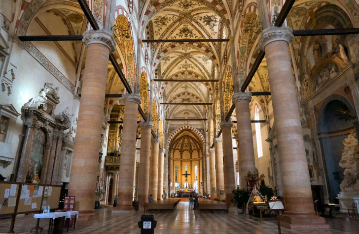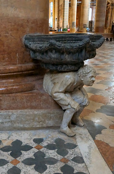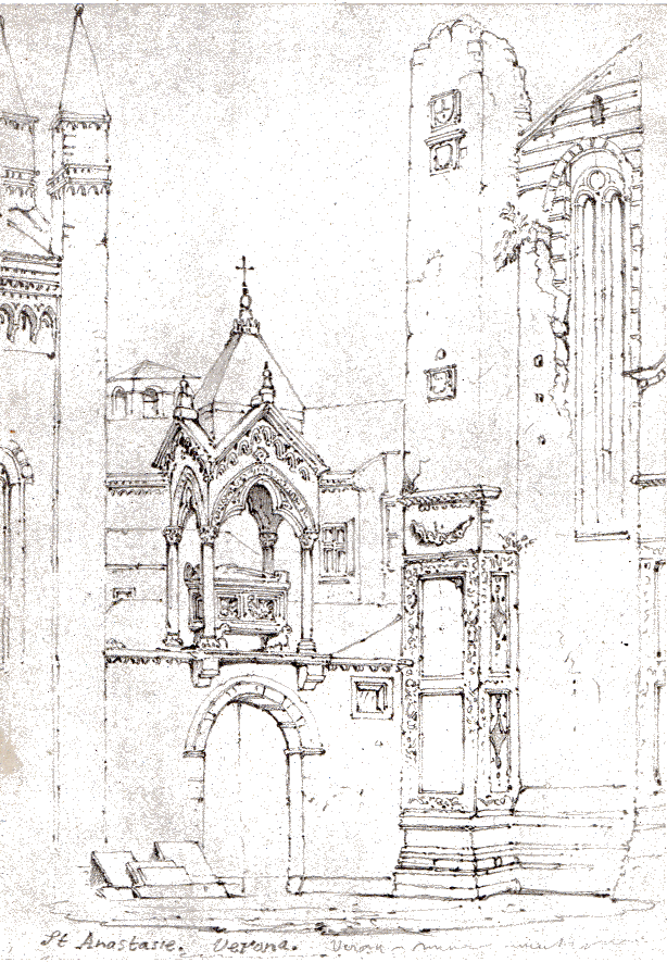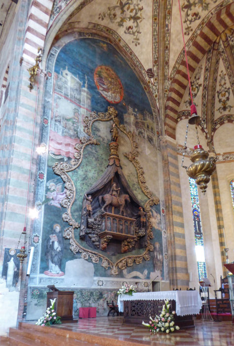 History Work on this gothic church, the largest church in Verona, begun in 1290, to designs by two Dominican friars Fra Benvenuto da Bologna and Fra Nicolò da Imola. Work continued through the 14th and 15th centuries, and was finally completed in 1481, although the façade was never finished - there's just the portal. Sant'Anastasia was the name of the previous church on the site, built during the 9th century, and by tradition the church retains this name. From 1307 it was named after St. Peter Martyr, the co-patron saint of Verona, with Zeno, and the first Dominican martyr - an inquisitor assassinated by heretics in 1252. Not consecrated until 1471, the church was run by the Dominicans until 1808. Façade The doorway has an arch of impressive polychrome marble. The white, pink and grey-blue colours are repeated in the marble floor inside. The carved panels in the architrave directly over the two doors depict scenes from The Life of Christ. The relief panels to the right depict The Martyrdom of Saint Peter Martyr and the Miracle of the Cloud which shaded the saint as he preached. The series was to have been continued in the empty frames to the left of the door. To the left is the entrance is the cemetery gate, over which is placed the tomb of Guglielmo de Castelbarco, a major financer of the enlargement of the church. It was drawn (see below right) and described by John Ruskin, not a man known for half measures, as 'the most perfect Gothic sepulchral monument in the World'. Late-19th-century restoration saw it topped with crude weather-proof canopy. Interior ![]() The interior, a nave and two aisles separated by six columns each side, strikes you first with the very Alpine style flower decoration of the vaulting. The oldest such ceiling decoration is from the 14th century and to be found in the transept and the first bay back up the nave, with the work getting later as the bays progress towards the back. On the first column on the left there's a hunchback supporting a holy water font which is said to have been carved by Veronese's father Gabriele in 1495 (see right). There is no documentary evidence for this, however, and it seems that the painter's father was a humble stonecutter, with his heightened status as a sculptor a creation of Ridolfi. The floor is original and is in the colours of the Dominican habit plus the blood of Christ (Verona marble). The position of the original tremezzo (screen) is visible in the messing-up of the design on the paving across the nave between the organ and the side entrance. The first four altars feature works by Francesco Morone, Niccolò Giolfino (the Faella Altarpiece), Felice Brusasorci and Niccolò Giolfino again (The Descent of the Holy Spirit 1518) (with the lunette by Morone) respectively, and impressively. After the big gilt organ is the Rosary Chapel, built by Domenico Curtoni in the late 16th century to celebrate the Venetian victory at Lapanto which the Company of the Rosary fought in. Two dark late-16th century paintings flank a lovely 1358/9 Lorenzo Veneziano altarpiece depicting the Madonna of Humility with Saints Peter and Dominic and Cangrande II and his wife Elisabetta (see far below right) formerly and traditionally ascribed to Giotto. Above there's a damaged dome painting, the Four Evangelists in the pendentives, and lunettes by Marcantonio Bassetti(?) 1586-1630 (The Assumption in the dome) a pupil of Felice Brusasorci. Hanging in the next chapel, the Sacristy and Giusti Chapel, through a doorway in the left transept, is a ship's rudder, a trophy from the Battle of Lepanto, as well as works by Brusasorci (the distant altarpiece) and Balestra. Also a fresco by Giovanni Badile. Various works around the doorway into the Giusti chapel, including a fresco of Jacopo Beccucci (in armour) presented to the Virgin Mary by the Second Master of San Zeno from the 14th century, whose fresco work is to be found in the first of the east-end chapels too, called the Salerni chapel, which is the base of the campanile. Also 14th century frescoes by Boninsegna, including one of the Virgin with a mysterious naked saint with snakes around his legs. The chapel just left of the presbytery, the Lavagnoli chapel has three vivid Mantagna-influenced frescos on the left wall by Falconetti. The lower scene Jesus Entering Capernum features a self-portrait of the artist with his brushes. The presbytery has, on the right wall, a Last Judgement full of congested queues by the Second Master of San Zeno and on the left the dominating Monument to Cortesia di Serego 1432 (see photo right) attributed to Pietro di Nicola Lamberti, with frescoes of city views. Cortesia was a condottiere who was one of the assassins of Bartolomeo II della Scalla, but he's not actually buried here. Also The Annunciation, and Saints Thomas Aquinas and Peter Martyr by the Venetian Michele Giambono. The whole is a multimedia feast of true fresco, a secco additions, painted stone, gilded pastiglie and silver laminate. The decoration of the ceiling vaults here was redone in the 19th century, the altar was refurbished in 1952 and the windows depicting saints are from 1935.