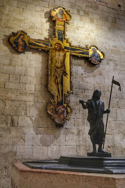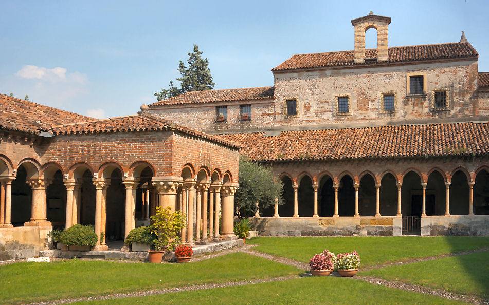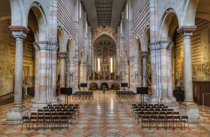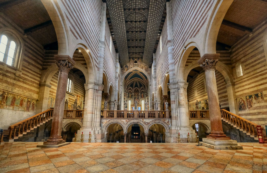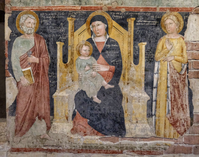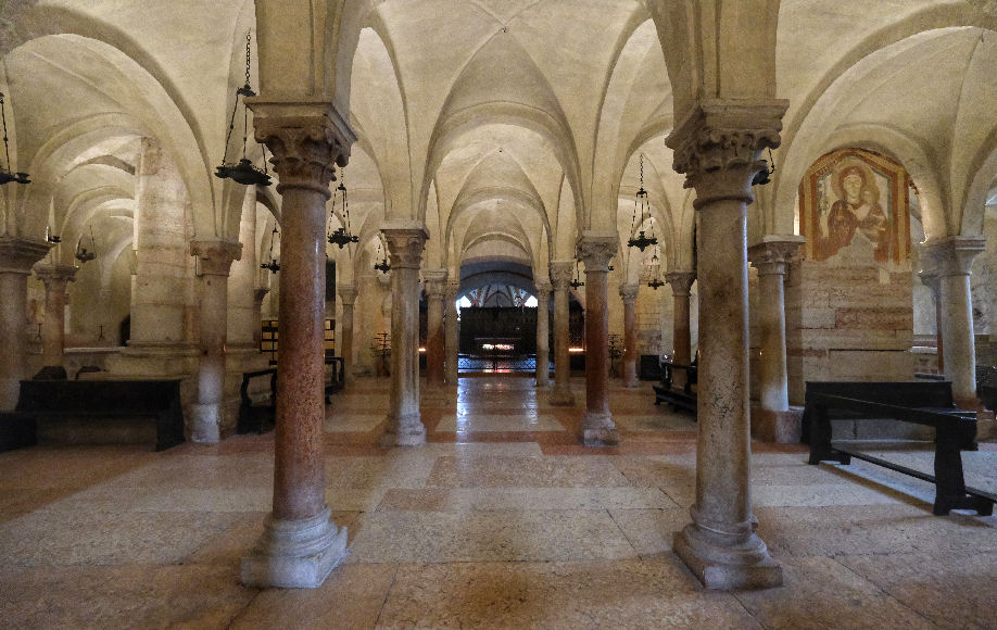 History The first small church was erected nearby in the 4th/5th century by the Ostrogoth king Theodoric, presumably around Saint Zeno's burial place in the cemetery here, which dated from Roman times. A church and Benedictine monastery was then built in the early 9th century, with the help ok Pepin, Kimg of Italy and son of Charlemagne, with consecration in 806 and soon after the translation of the saint's relics into the new church. After being severely damaged by the Magyar invasion of 951, a new Romanesque church was built by Bishop Raterius in 967, with financial help from the Holy Roman Emperor Otto I. This church was damaged on January 3rd 1117 by the earthquake which so affected so many of Verona's churches, and was rebuilt bigger at the city's expense, in 1123-1138, this being the almost-unchanged church we see today, called the Basilica di San Zeno. The church has remained unchanged as a building symbolic of the city's early communal government, which met here for civic as well as religious occasions. The roof and the Gothic-style apse date from 1398. Façade The cream-coloured facade is the work of sculptor/architect Brioloto with help from sculptor Adamino da San Giorgio, who seems to have especially enjoyed carving animals, which he did below the slanting roof cornices. It is a screen façade with a Lombard porch and a wall passage. The rose window in the shape of a Wheel of Fortune is 13th-century. The outer grey rim of the window is decorated with six figures representing the trials of human life. The porch and reliefs date to around 1138 and are the work of the sculptor Niccolò (aka Nicholaus) along with his assistant Guglielmo - his signature is visible in several places. He also worked on the porches of the duomos in Ferrara and Verona, the latter his last known work. St. John the Baptist and St. John the Evangelist flank the arch with the Lamb and the blessing hand of God in the centre. The polychrome lunette above the door shows St. Zeno stamping on demons and blessing the city's banners. Under the lunette are reliefs of the Miracles of St. Zeno and around is the cycle of the months. The door is flanked by panels of marble reliefs showing scenes from the New Testament on the left (signed by the assistant Guglielmo) and the Old Testament on the right To the left of the façade is the squat crenellated tower of the old abbey, which was mentioned by Dante in the Canto 18 of Purgatory and which contains 13th century frescoes. Between it and the church is the entrance to the church via the early 14th cloister. A small loggia (see photo below) protrudes on the cloister's north side which once housed a fountain for washing before entering the refectory (the lavatory of the monks, as one guidebook has it). Some of the tombs here have come from suppressed churches. They include those of Giuseppe della Scala and Ubertino della Scala, who was the prior of the adjoining monastery. ![]() Interior Latin cross shaped with striped walls created by layers of brick and stone. The nave is undecorated otherwise, up to the coffered ship's-keel wooden ceiling from the 14th century, a type seen only in the Veneto. The aisle walls have considerable frescoes though, from various periods. Between the nave and aisles are alternating compound piers and columns. There are three levels with a wide staircase down to a large crypt and two smaller ones up to the raised presbytery. ![]() The bronze doors can be admired opened into the church in the doorway. The panels on the left door arguably date from the 12th century, are described as 'German school, and depict scenes from the New Testament. Those on the right are later and by a local artist, and depict scenes from the Old Testament. Thirteen steps lead down from the door. Inside the church in the corner to the right of the doors is a Crucifix by Lorenzo Veneziano (see right, recently - December 2022 - returned from restoration) and an octagonal baptismal font from the 13th century. The first (Renaissance) altar on the right has an altarpiece (1520) by Francesco Torbido depicting the Virgin and Child and Saint Anne with Saints Zeno, James, Sebastian and Christopher. The surrounding fresco work is attributed to Battista del Moro. On the wall just beyond is a patch of frescoes from the 13th to 15th centuries, including a large 14th century Saint Christopher. On the pilaster is the very faint so-called White Madonna, described as 'school of Giotto'. The next altar has odd knotted-effect marble columns retrieved from a Romanesque porch demolished in the 13th century holding up a wooden tympanum. Behind it and up the stairs into the upper church are more frescos of various periods, dominated on the right by a Saint George and the Dragon above The Transportation of Saint Zeno's Relics. The frescos to the left of Saint George, showing The Baptism of Christ and The Raising of Lazarus are amongst the oldest here. Many are embellished with period graffiti which evidently refer to events in the 15th and 16th centuries like floods earthquakes and plagues (see photo right). The Saint George and one of the many depictions of the Virgin Enthroned nearby are given to the so-called Second San Zeno Master. In the apse (see photo below) built by Giovanni and Nicolò da Ferrara from 1386 to 1398, the high altar rests on the sarcophagus of Veronese bishops Lupicino and Lucillo and the hermit Crescenzano. The frescoes at the back, from before 1412, which would have been the focus of the church before Mantegna's altarpiece, are by Martino da Verona, as is The Annunciation on the arch around the apse.