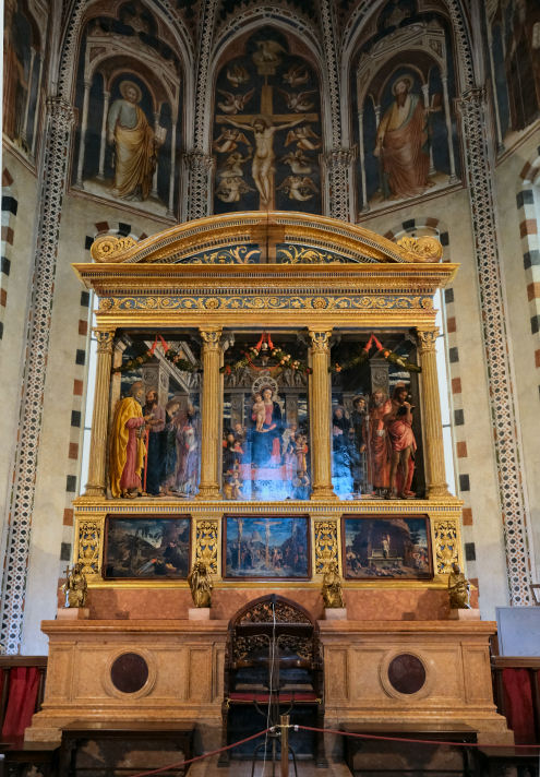 The altarpiece (see above) is by Andrea Mantegna (1457-9), known as the
